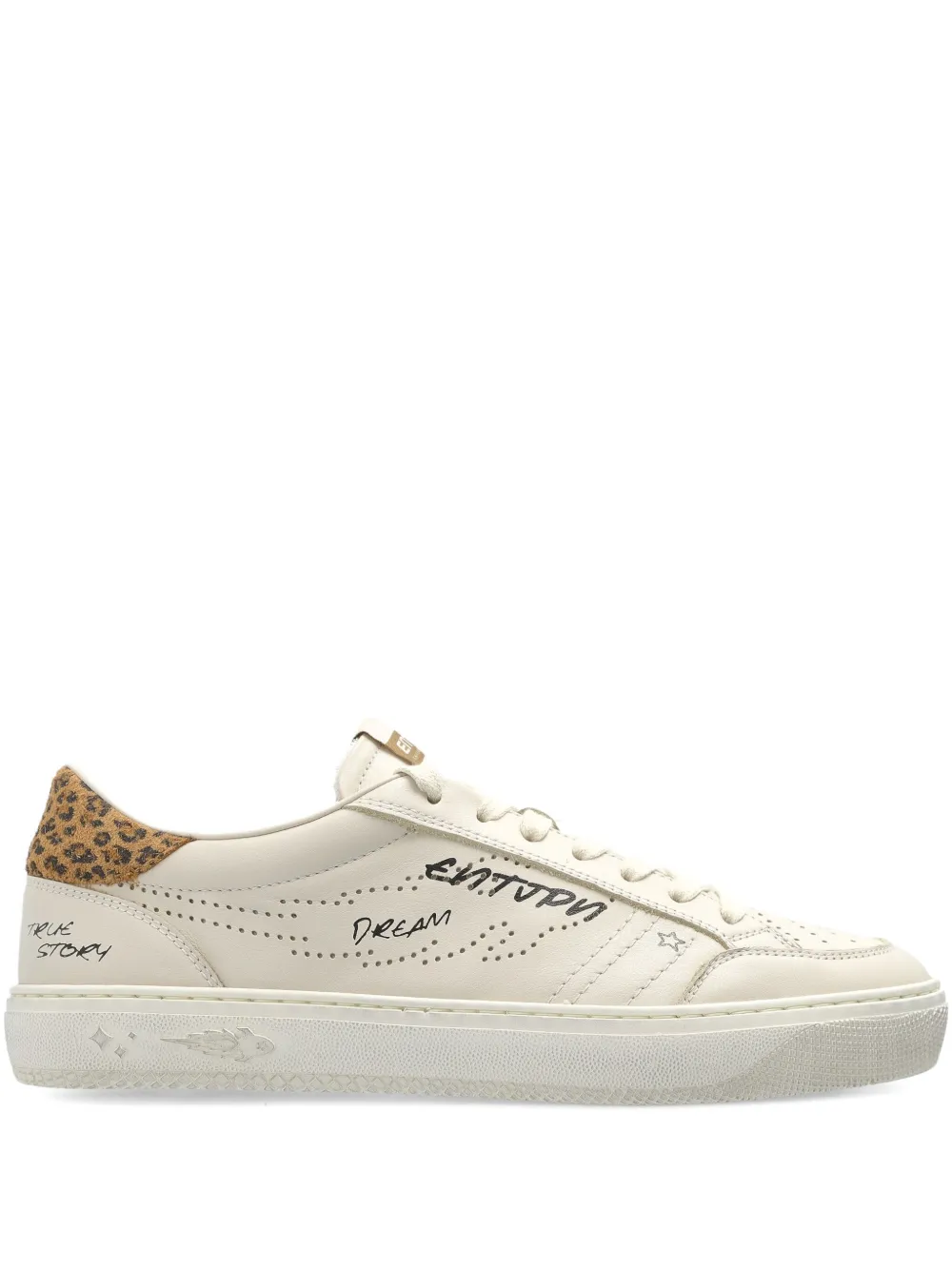 Белый цвет, леопардовый принт на заднике, перфорированные детали, резиновая подошва, шнуровка