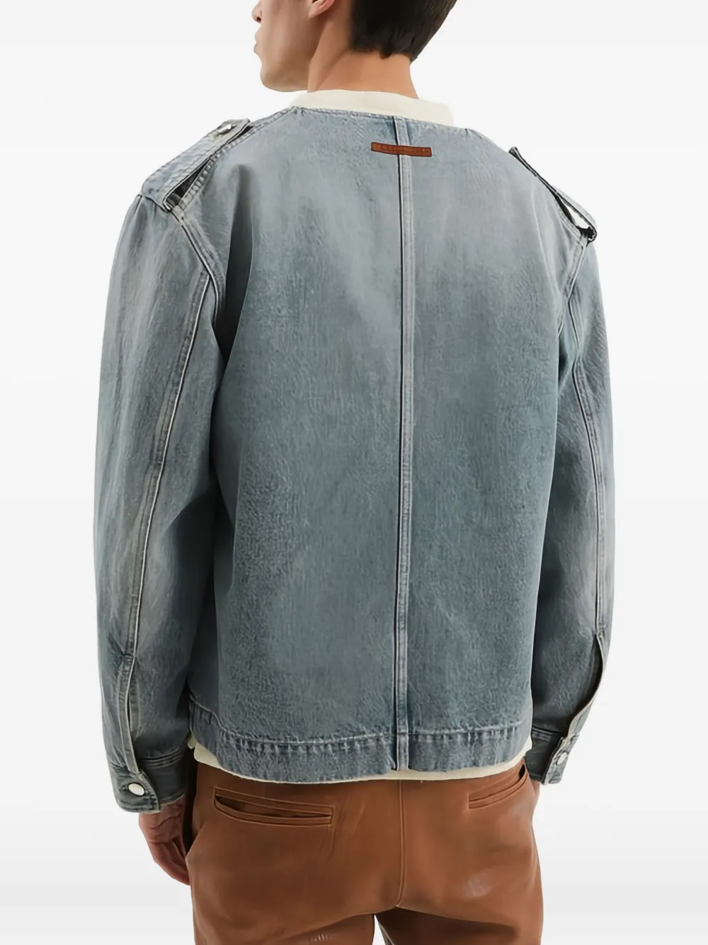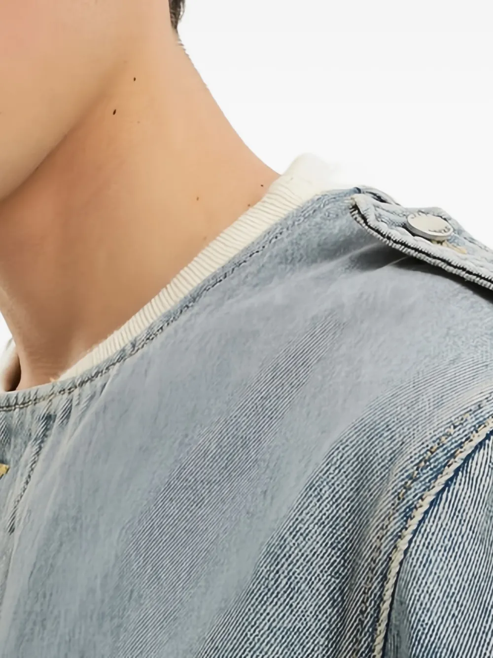 Светло-голубой патчворк-дизайн, застежка на пуговицы, нагрудные карманы, наплечные погоны, круглый вырез