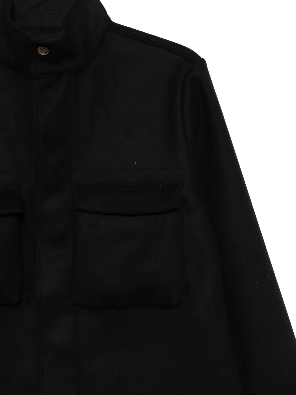 Черная скрытая застежка на пуговицы и молнию, воротник, нагрудные карманы с клапаном, манжеты на пуговицах