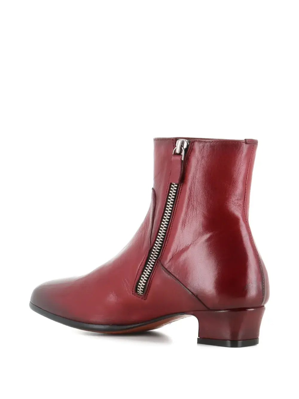 Темно-красный кожаный верх, застежка-молния, каблук-«столбик», круглый носок