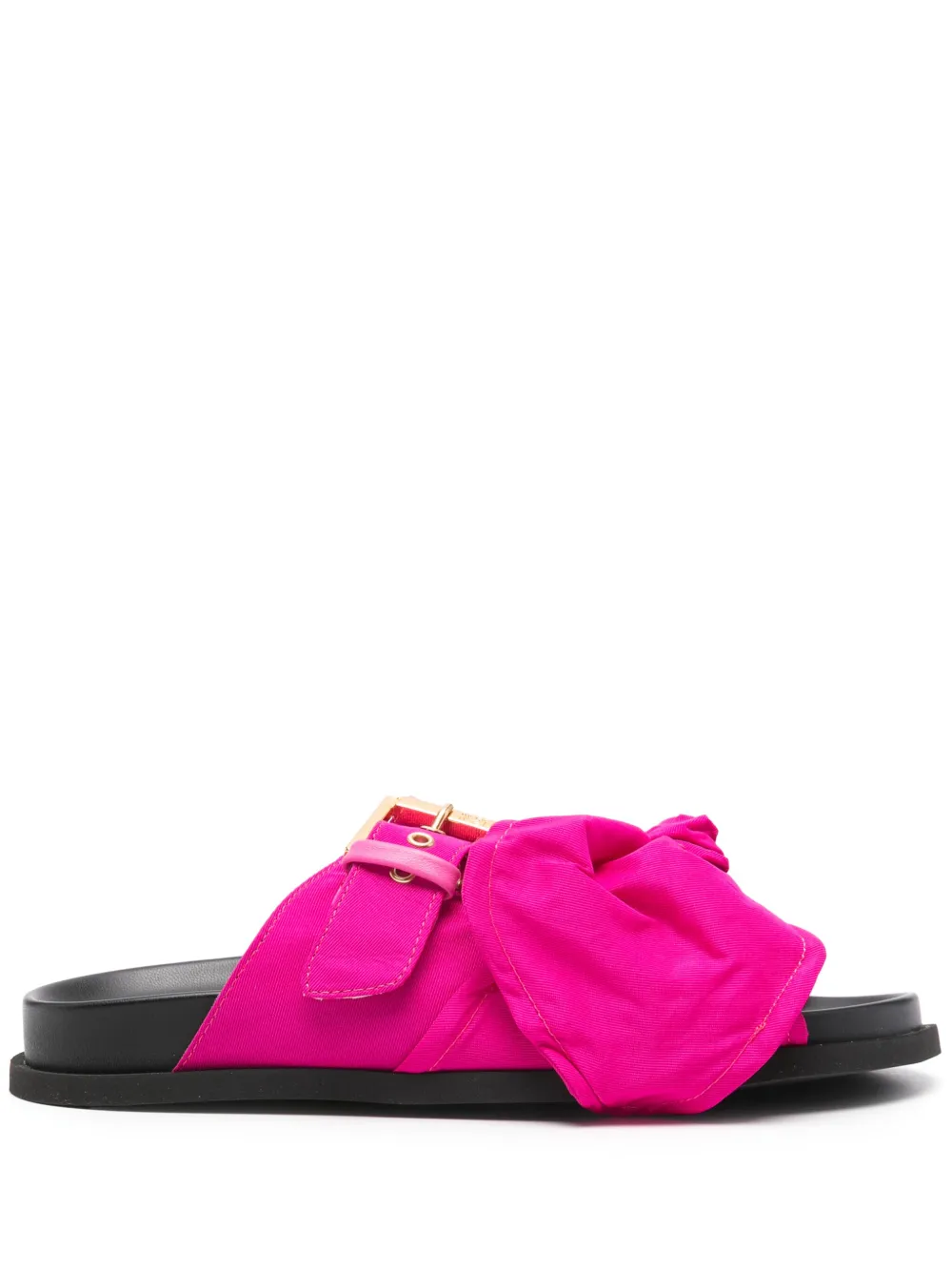 Розовая деталь в виде банта, застежка-пряжка, открытый носок, плоская подошва, фурнитура цвета золота