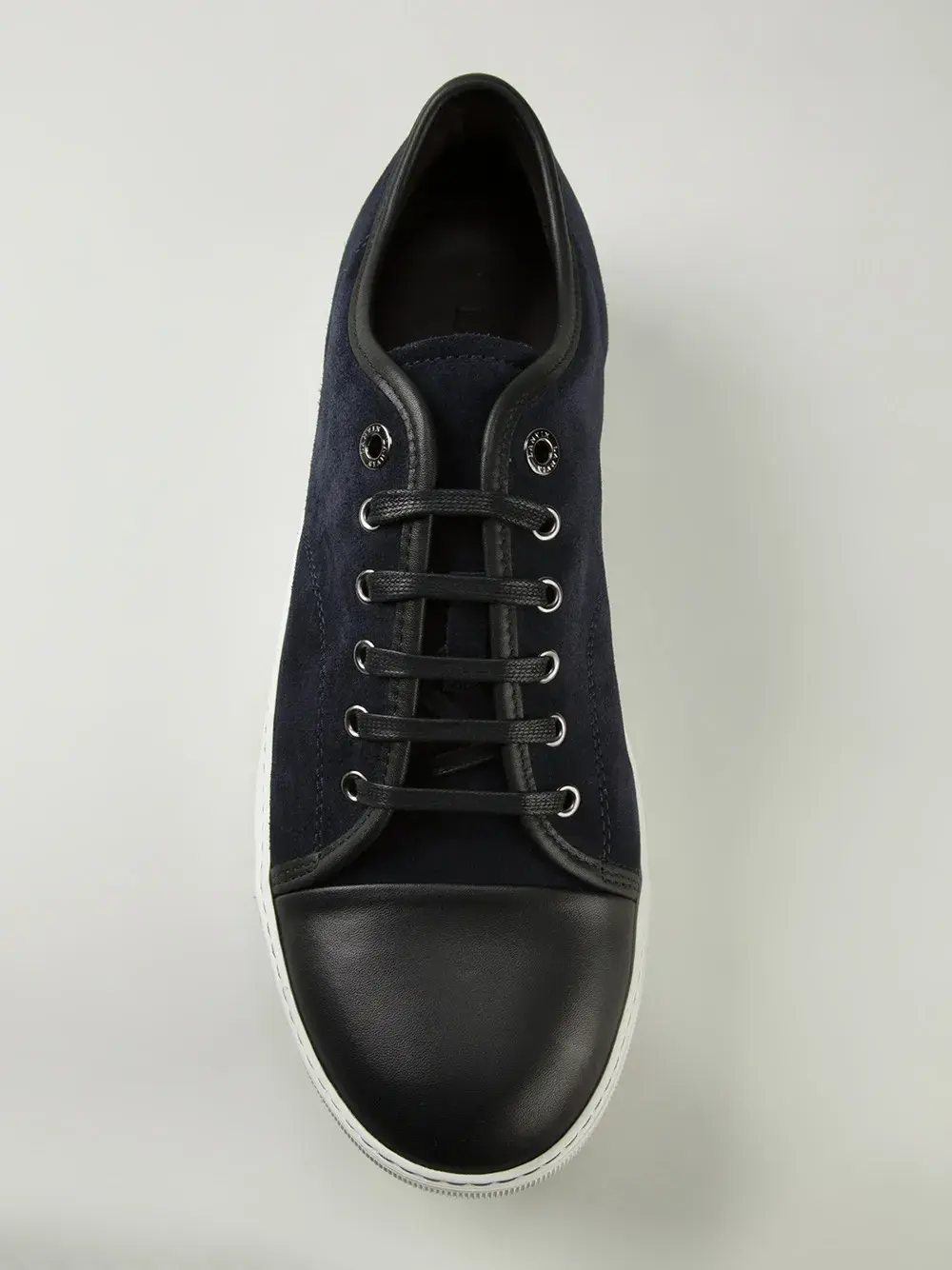 Темно-синие кеды из телячьей кожи с кожаным носком от Lanvin. Закругленный носок, шнуровка спереди, белая резиновая подошва.
