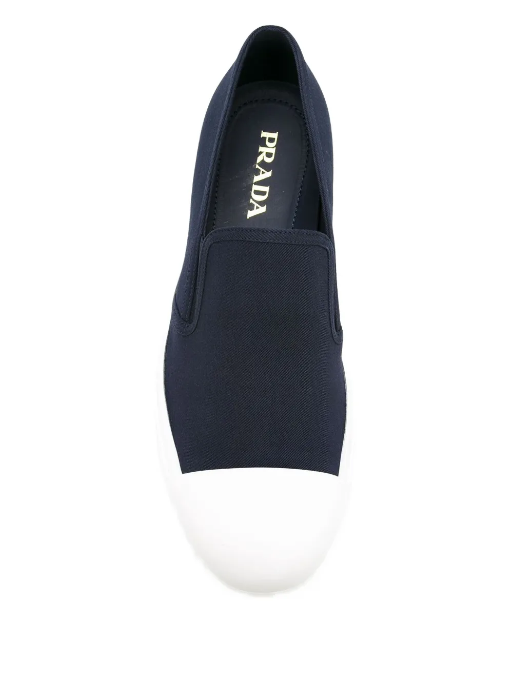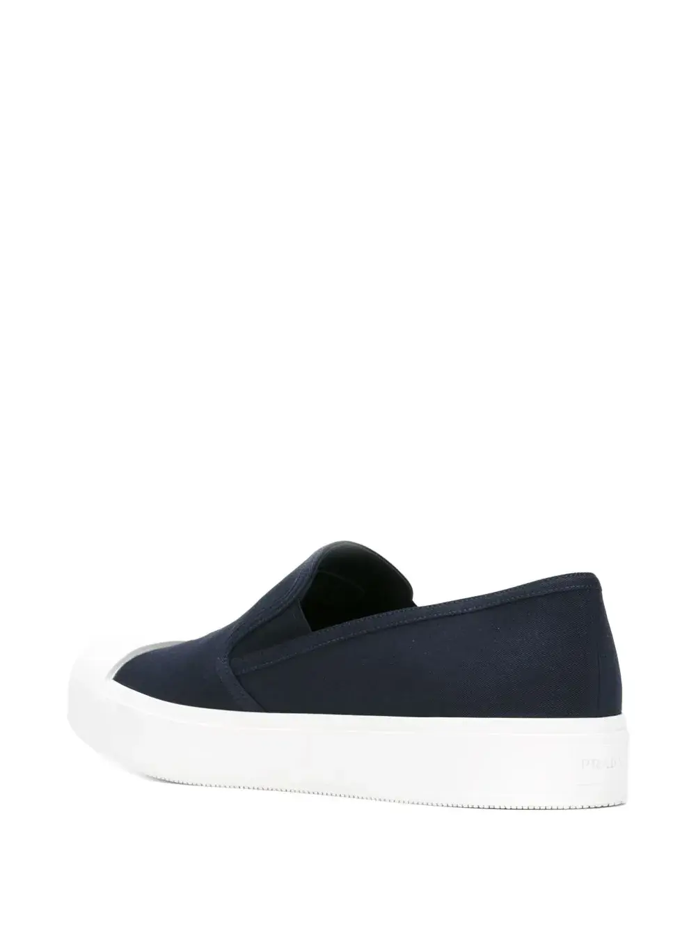 Темно-синие хлопковые кроссовки-слипон от Prada. Закругленный носок, контрастный носок, эластичные боковые панели, стелька с тиснением бренда, белая резиновая подошва, подошва на платформе.
