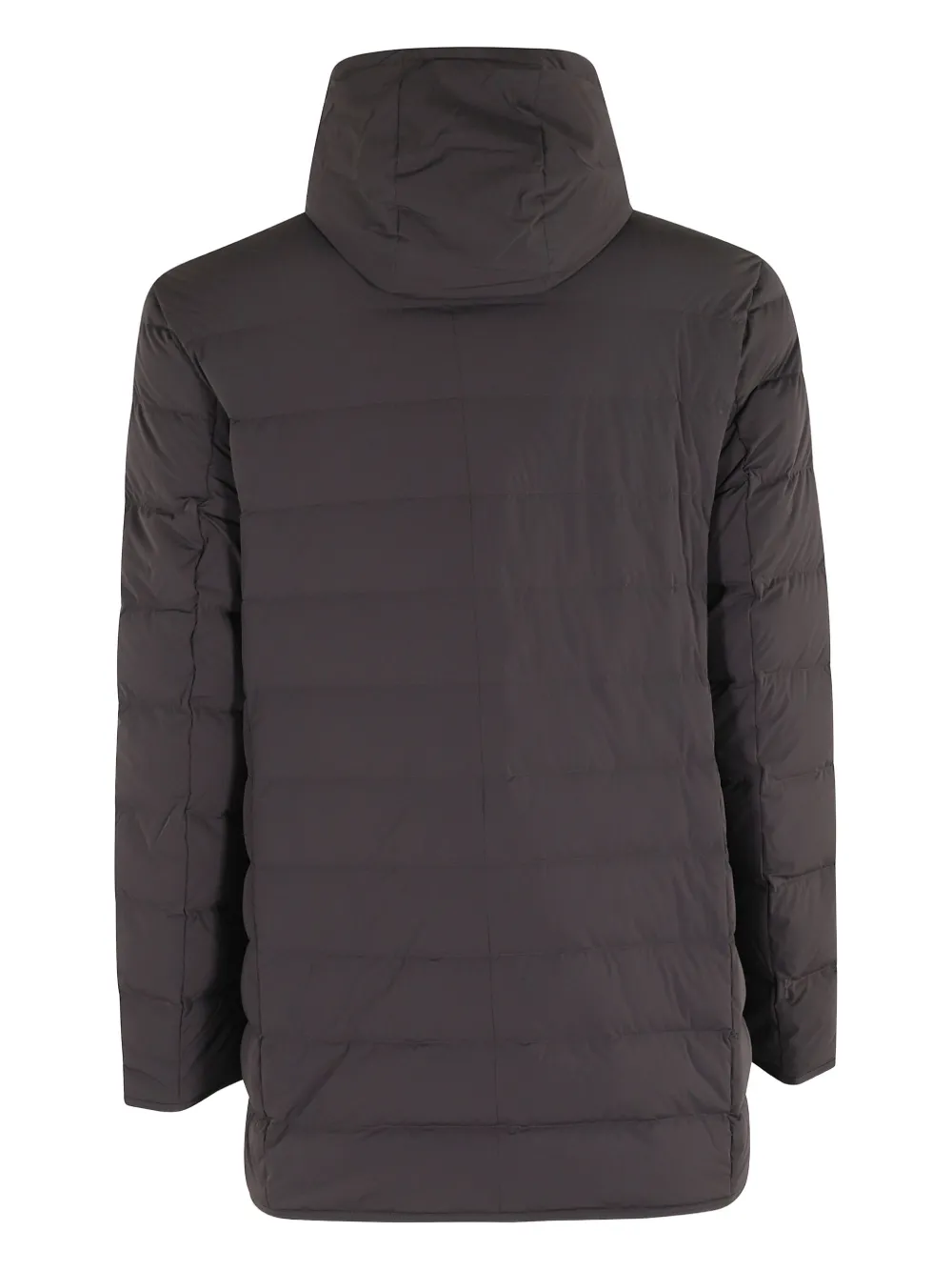 Темно-коричневый, застежка на пуговицы спереди, передние карманы на молнии, капюшон