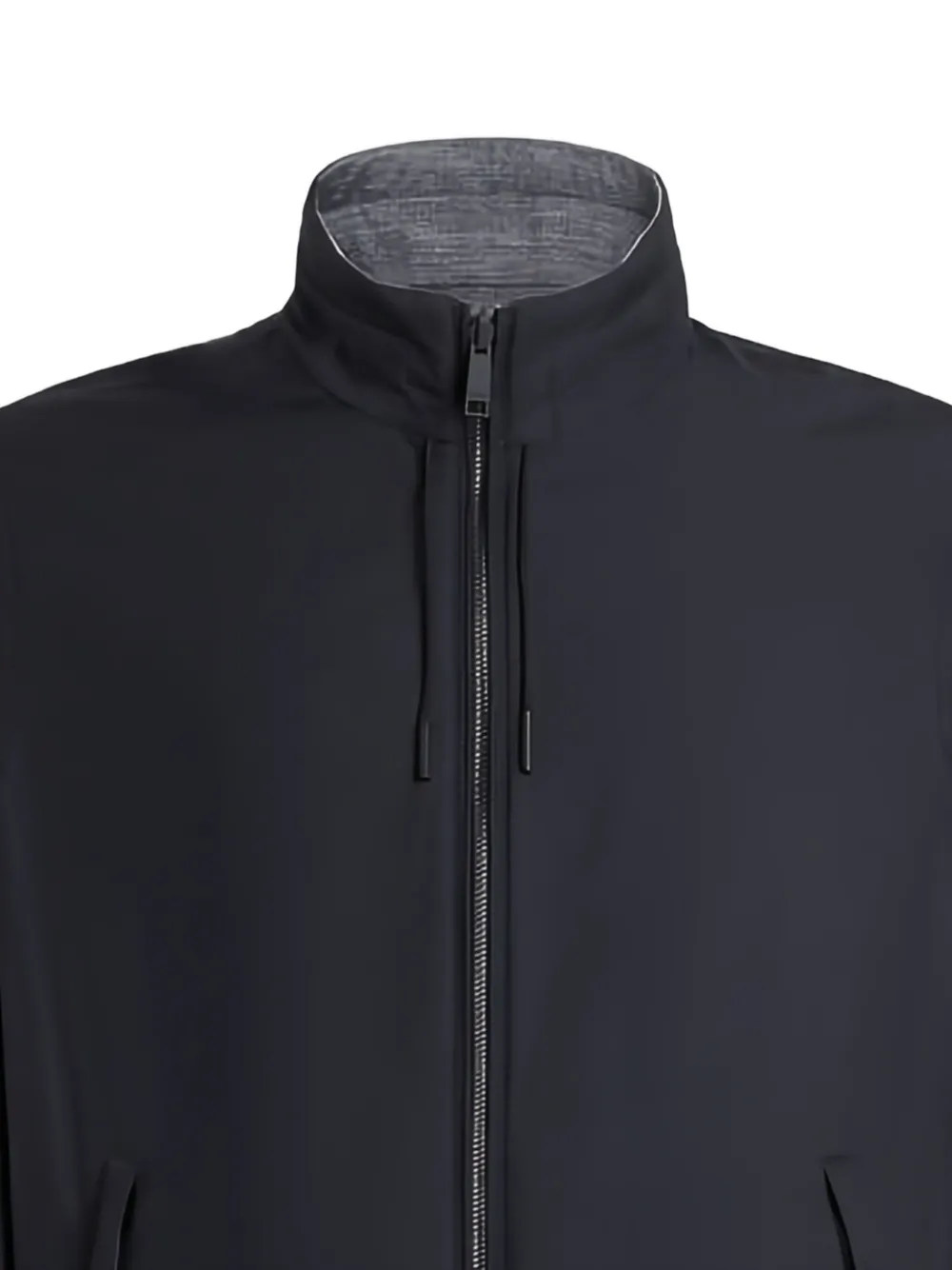 Темно-синий цвет, застежка-молния, кожаная отделка, высокий воротник, эластичные манжеты, прорезные карманы
