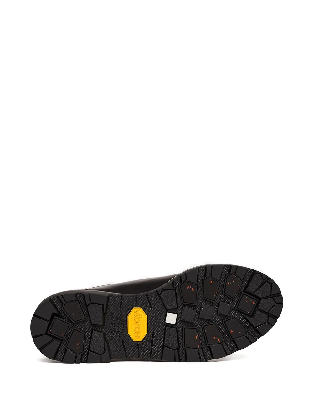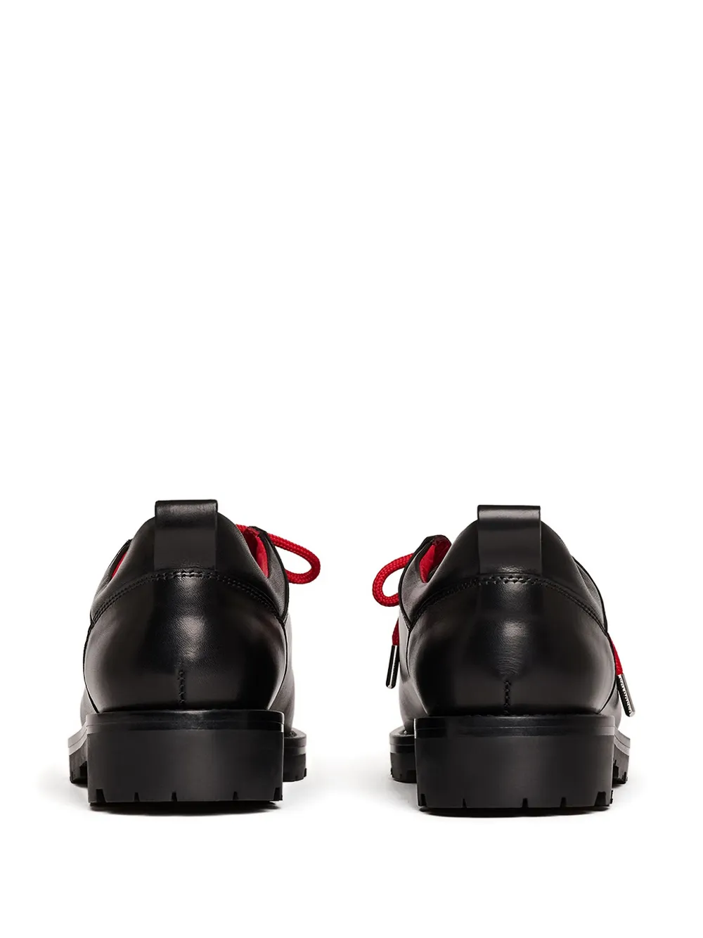 Черная шнуровка, массивная подошва, петля на пятке, фурнитура серебристого цвета, контрастная внутренняя отделка