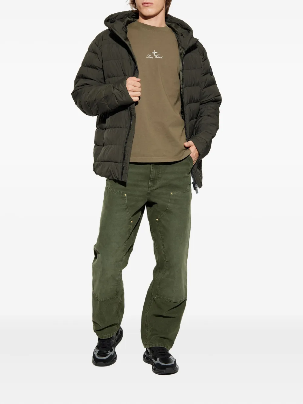 Зеленая стеганая куртка с капюшоном, логотипной нашивкой и застежкой на молнии