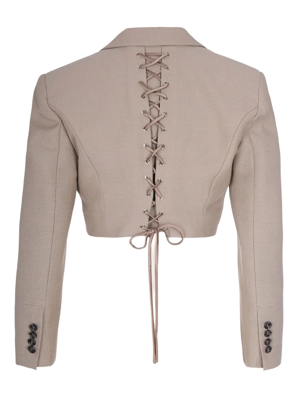 Светло-серый цвет, отделка шнуровкой, застежка на пуговицы, длинные рукава, заостренные лацканы, укороченный силуэт