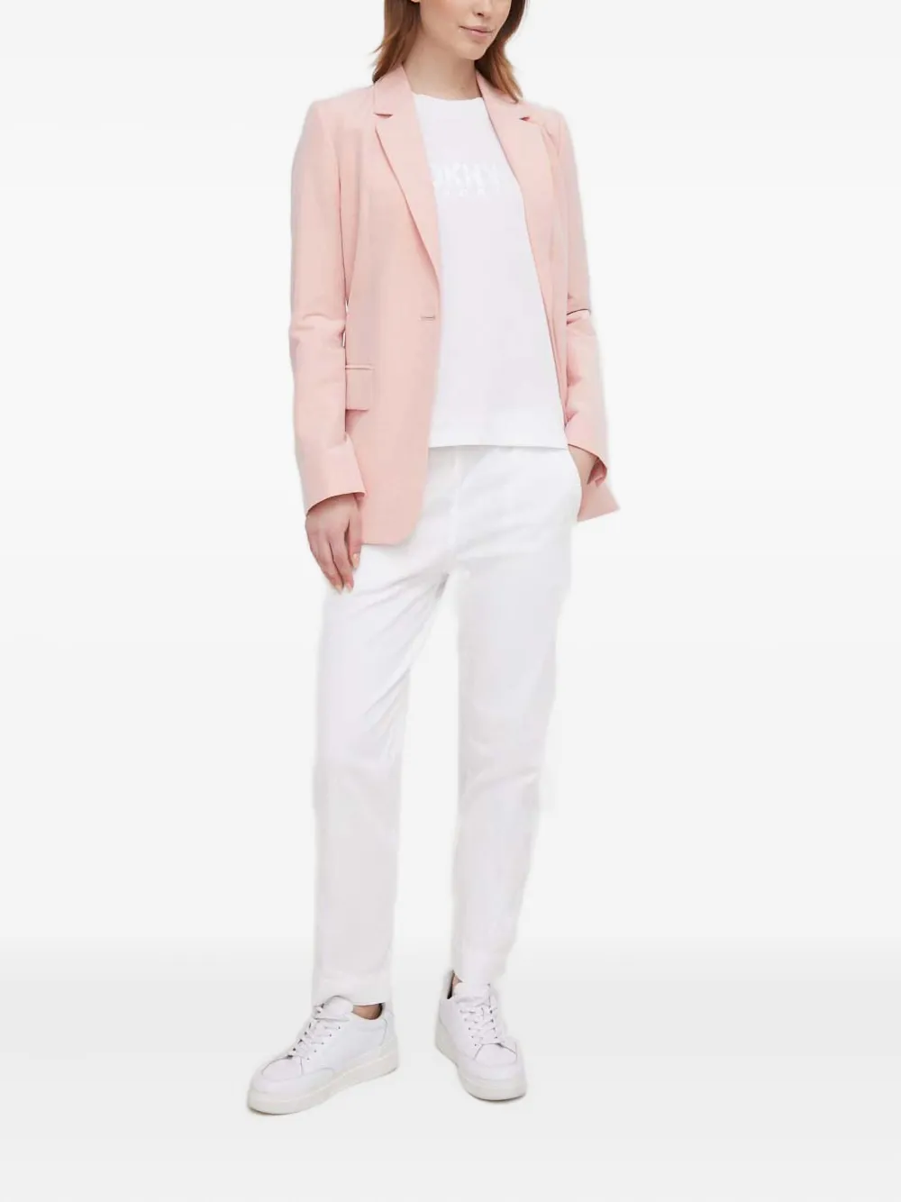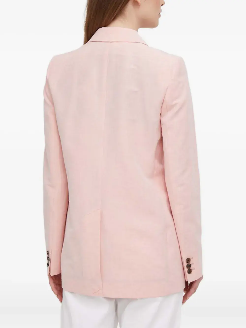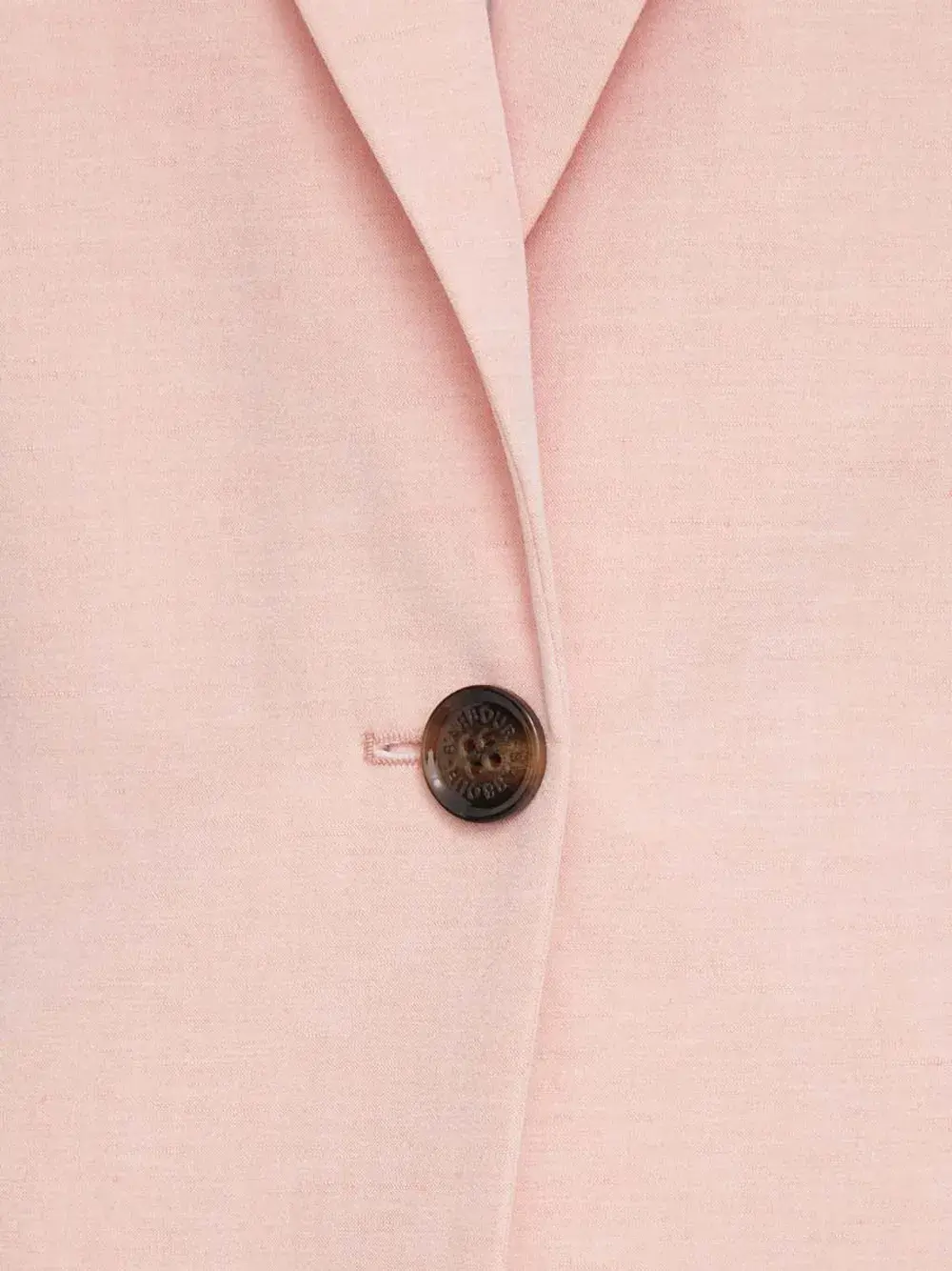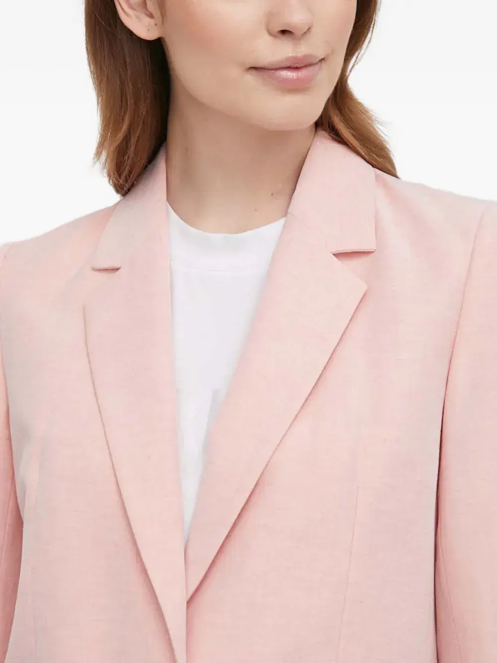Розовый цвет, застежка на одну пуговицу, лацканы с вырезом, длинные рукава, прямой низ