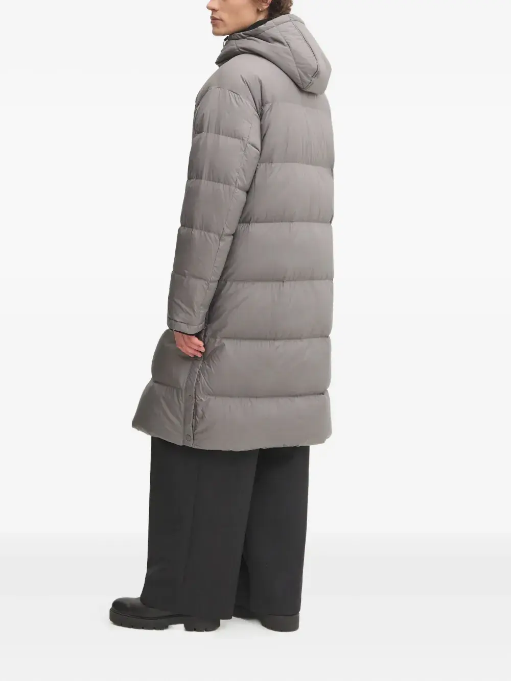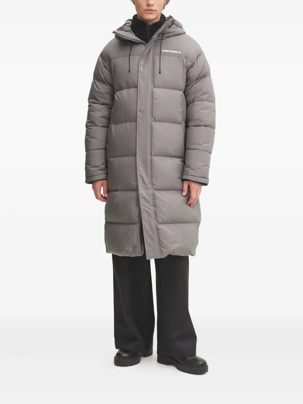 Серый пуховик с капюшоном, логотипом, длинными рукавами и застежкой-молнией спереди
