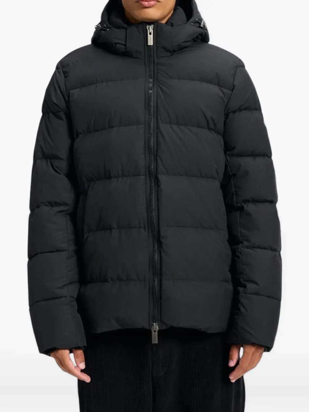 Черный цвет, съемный капюшон, застежка на молнии, нашивка с логотипом, стеганый дизайн, длинные рукава