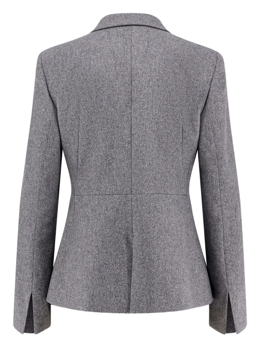 Серый однобортный пиджак с лацканами с вырезом, застежкой на пуговицу, длинными рукавами и клапанным карманом