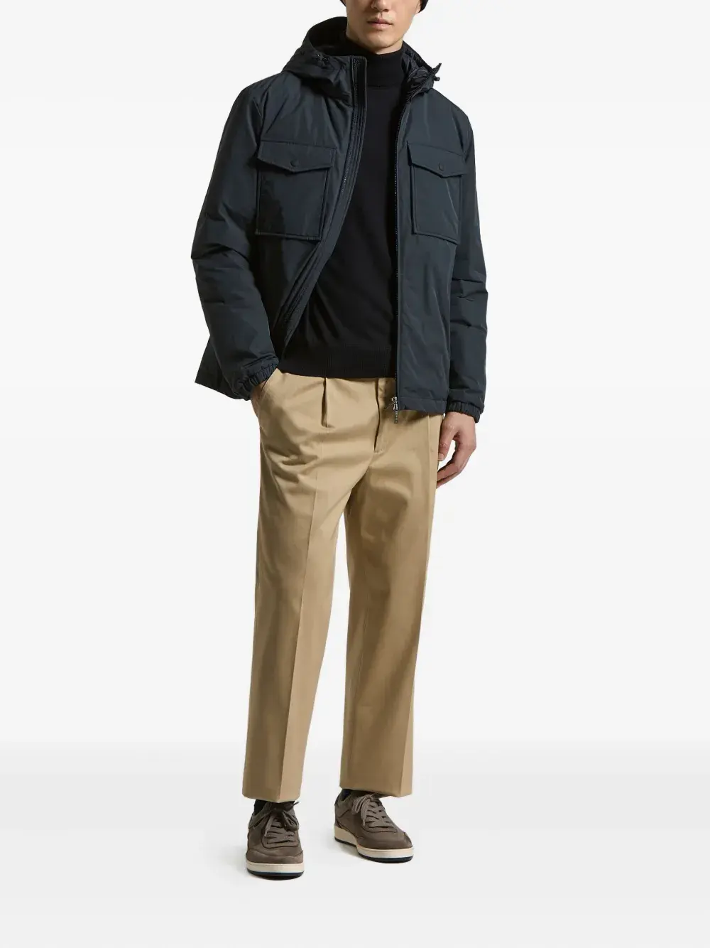 Синий капюшон, застежка-молния спереди, два передних накладных кармана с клапанами, длинные рукава, эластичные манжеты