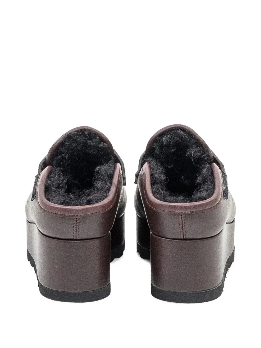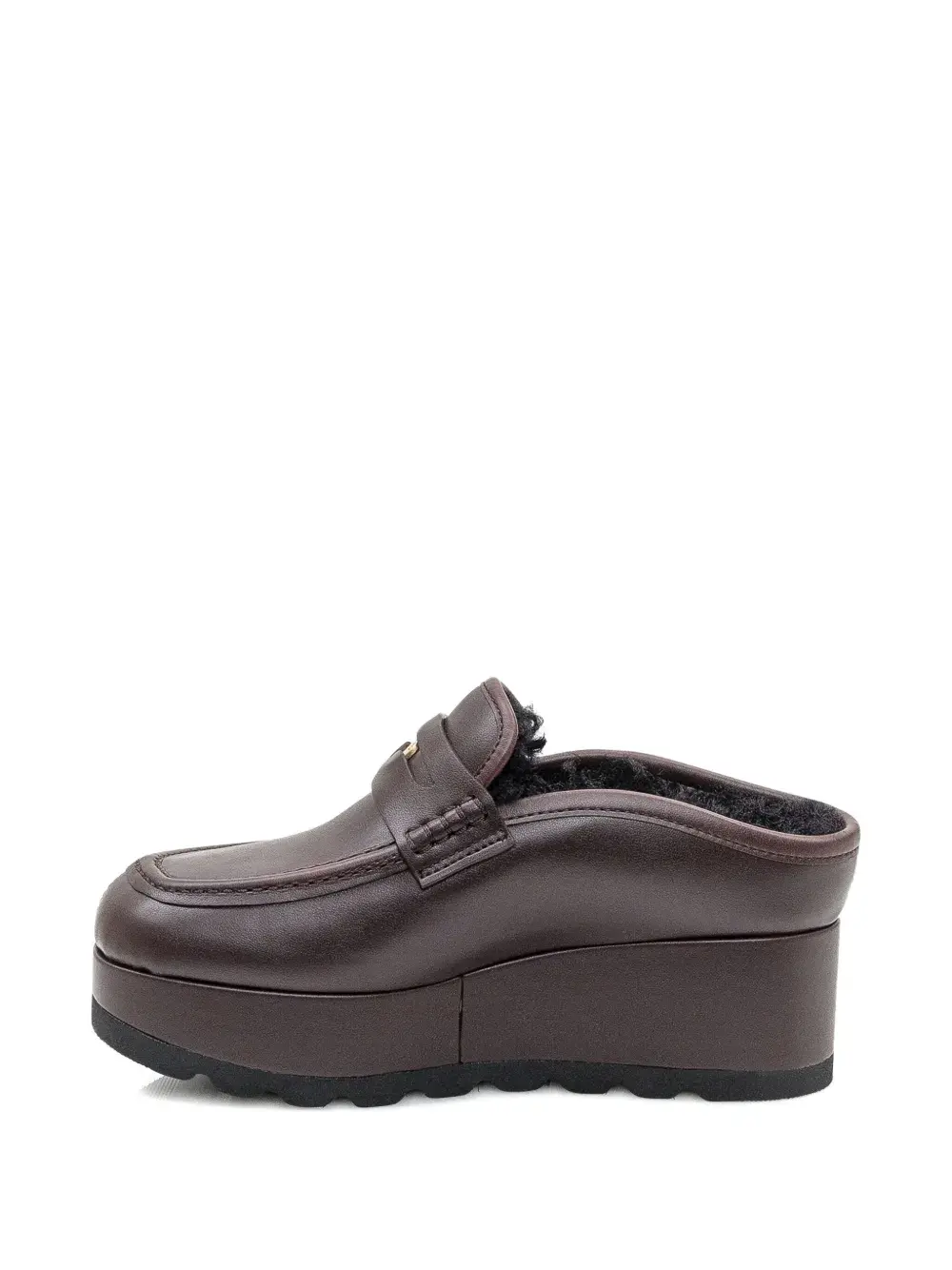 Цвет мокко, подошва на платформе, фурнитура цвета золота, модель без застежки, отделка искусственным мехом, декоративный ремешок (penny strap)
