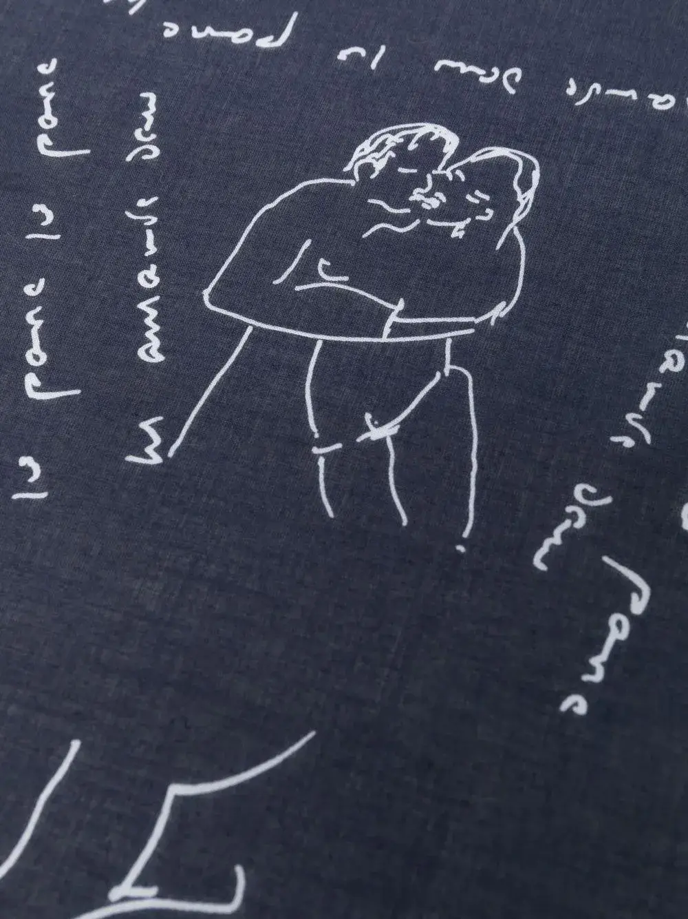 Темно-синий, хлопок, сплошной графичный принт, квадратная форма и обработанные края.