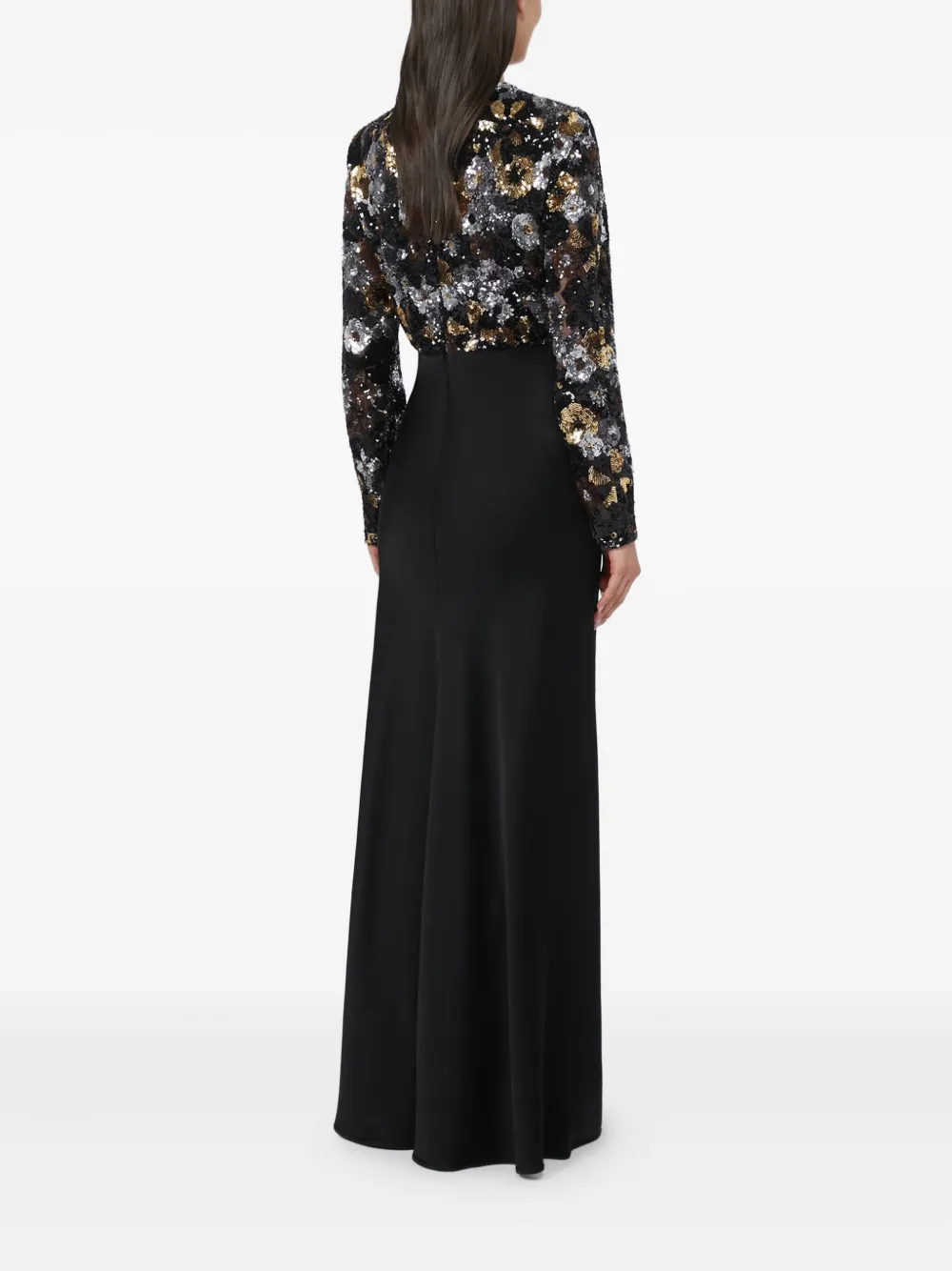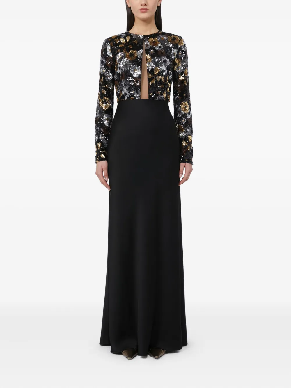 Черная отделка пайетками, длинные рукава, круглый вырез, скрытая застежка-молния, длина в пол