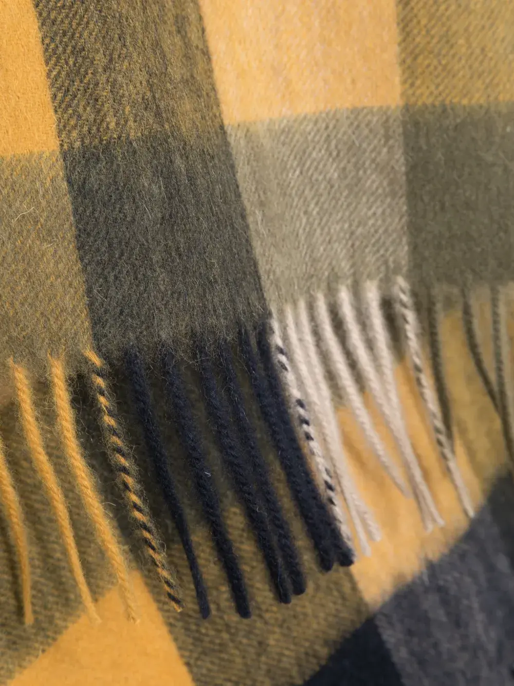 Черный, желтый, шерсть, принт в шотландскую клетку, матовый эффект, прямоугольная форма, необработанные края и несколько оборотов.