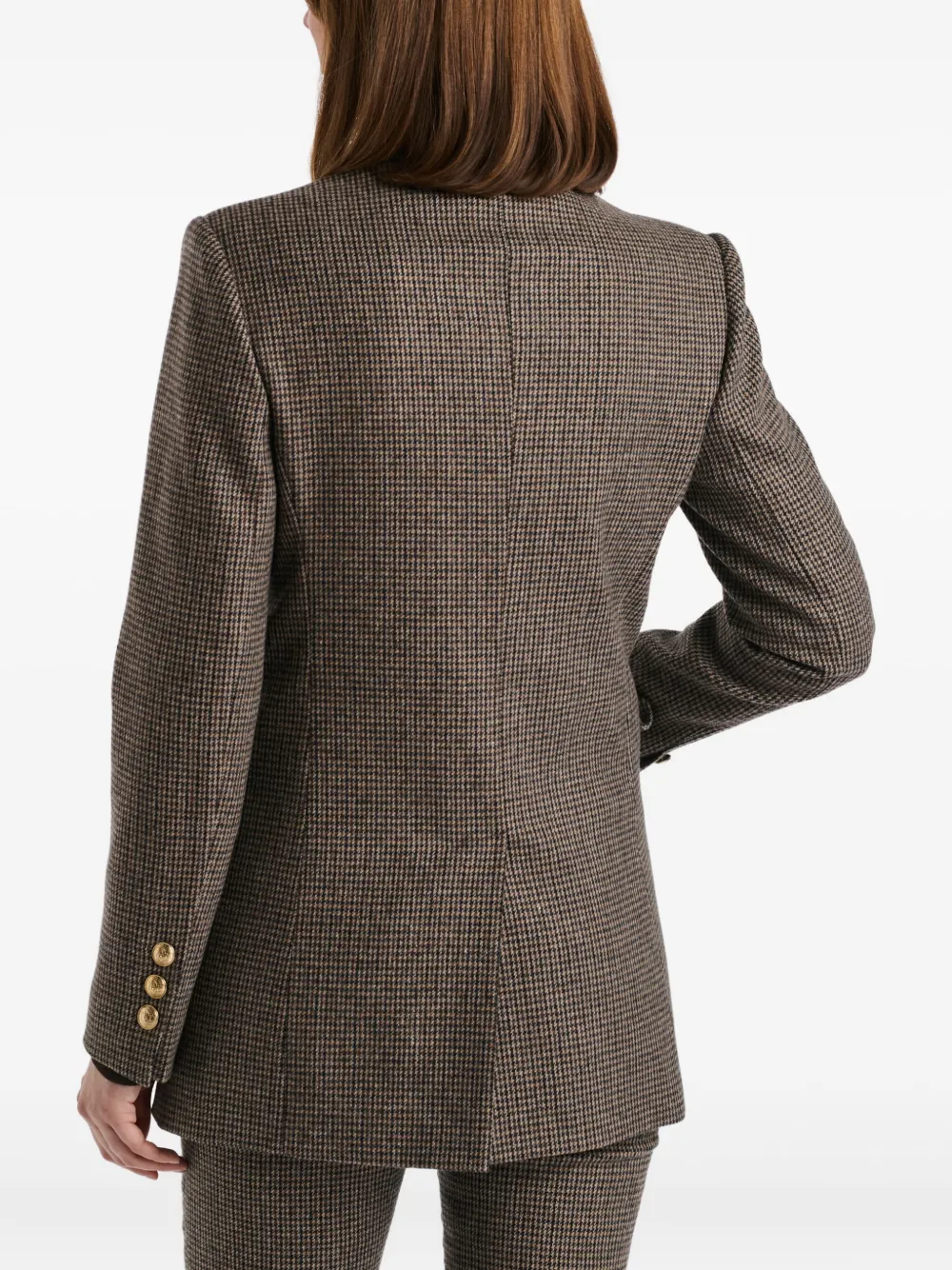 Коричневый в клетку, золотистые пуговицы, лацканы с вырезом, накладные передние карманы с клапанами, длинные рукава, застежка на крючок
