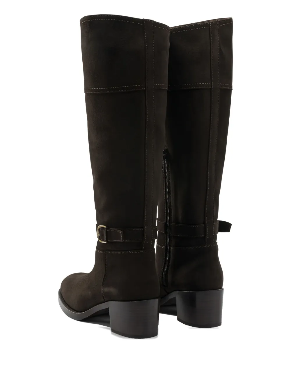 Темно-коричневые ботинки с боковой молнией, на блочном каблуке, ремешком с пряжкой, тональной прострочкой и квадратным носком