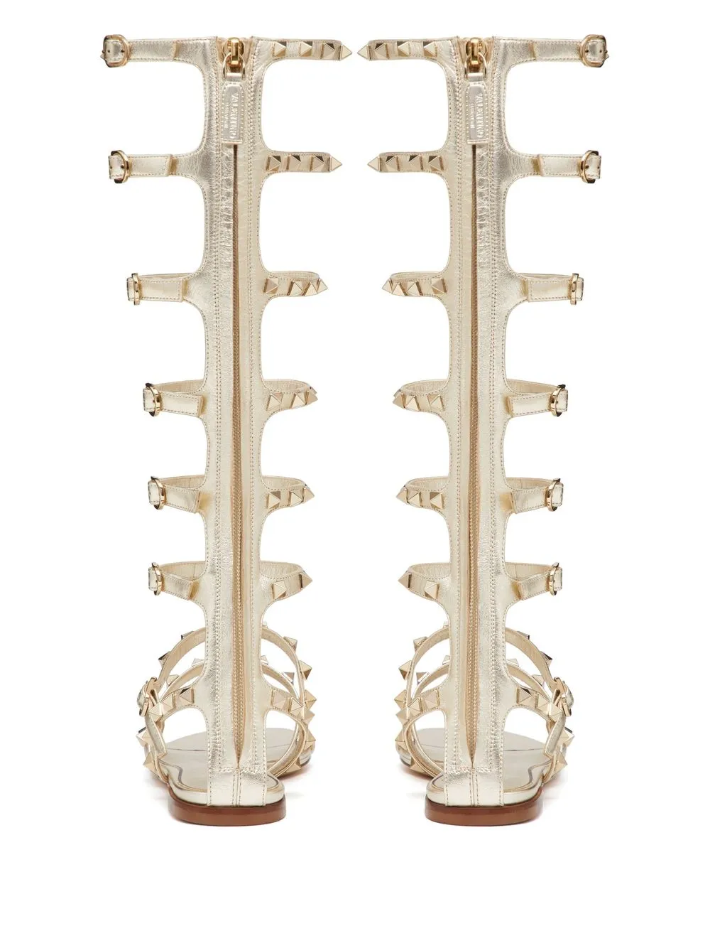 Золотистый, телячья кожа, покрытие с эффектом металлик, золотистые заклепки Rockstud, застежка на молнии сзади и плоская подошва.