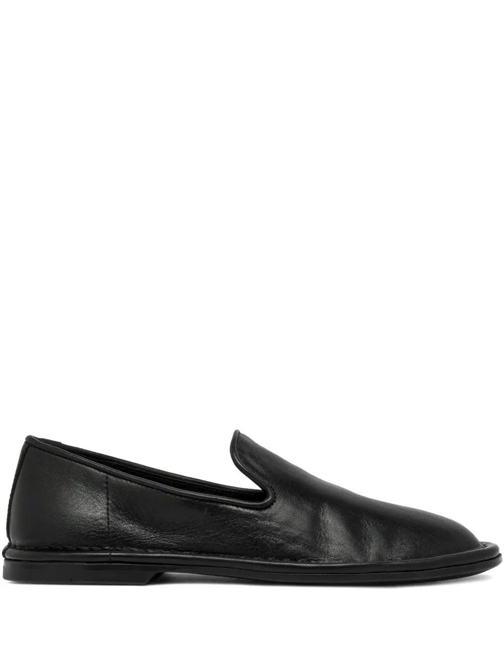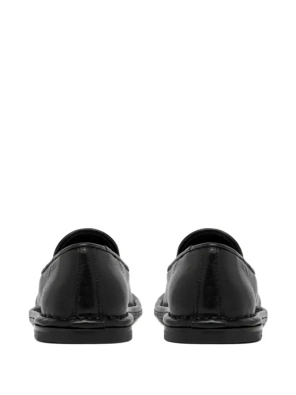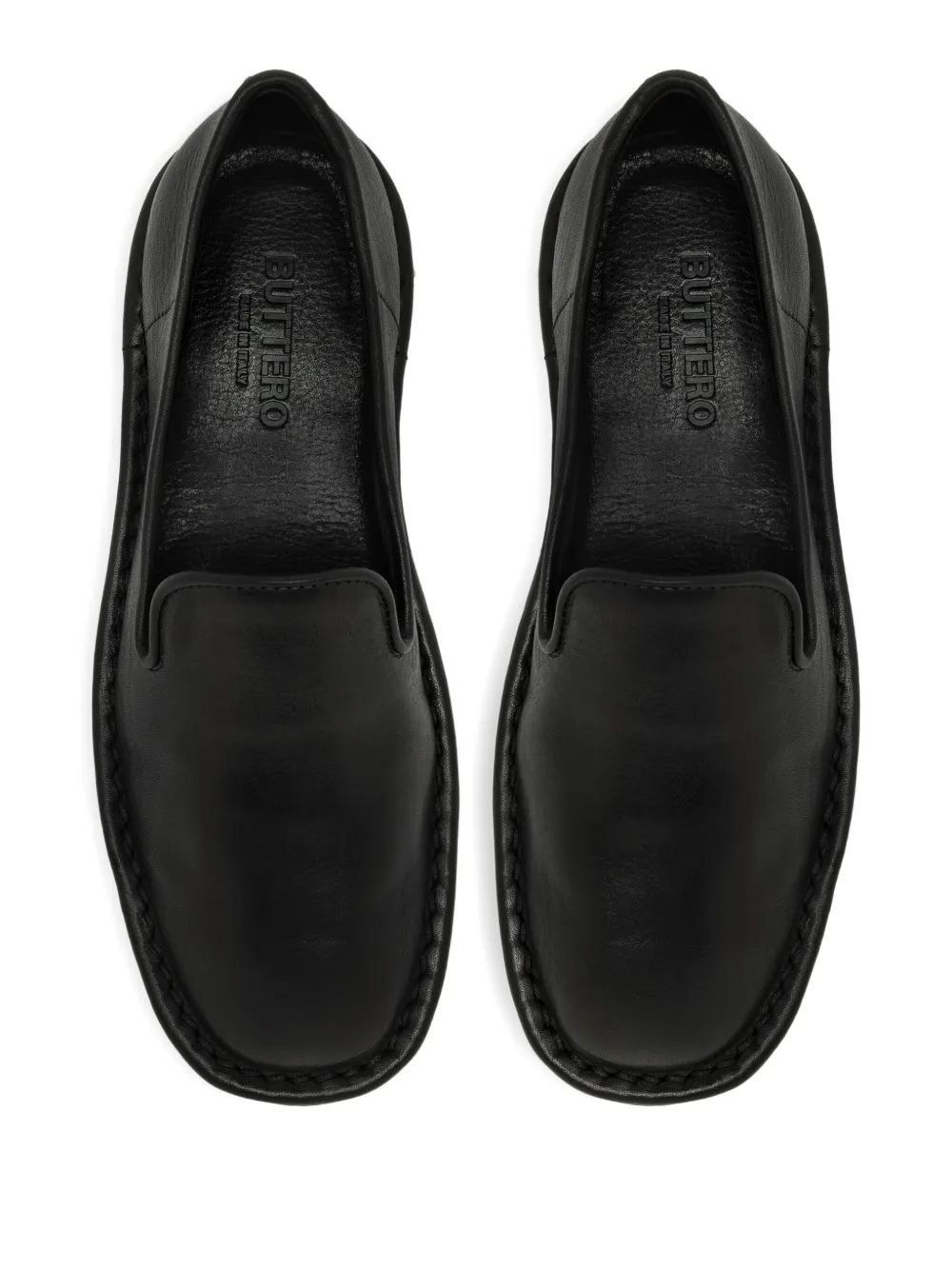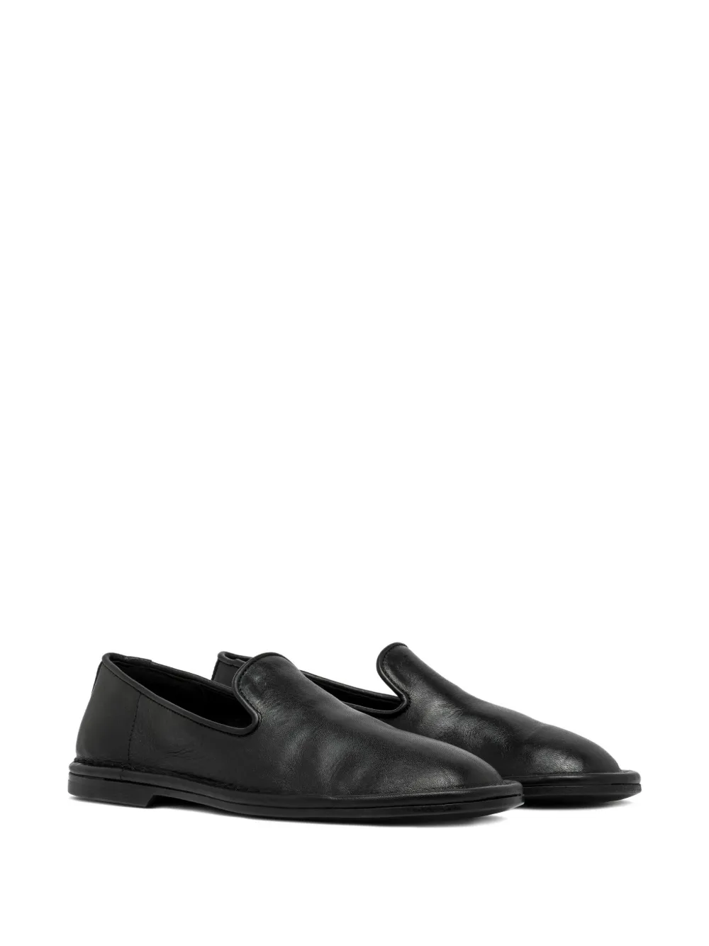 Черные туфли-слипоны, круглый носок, плоская подошва, однотонная строчка, верх из кожи