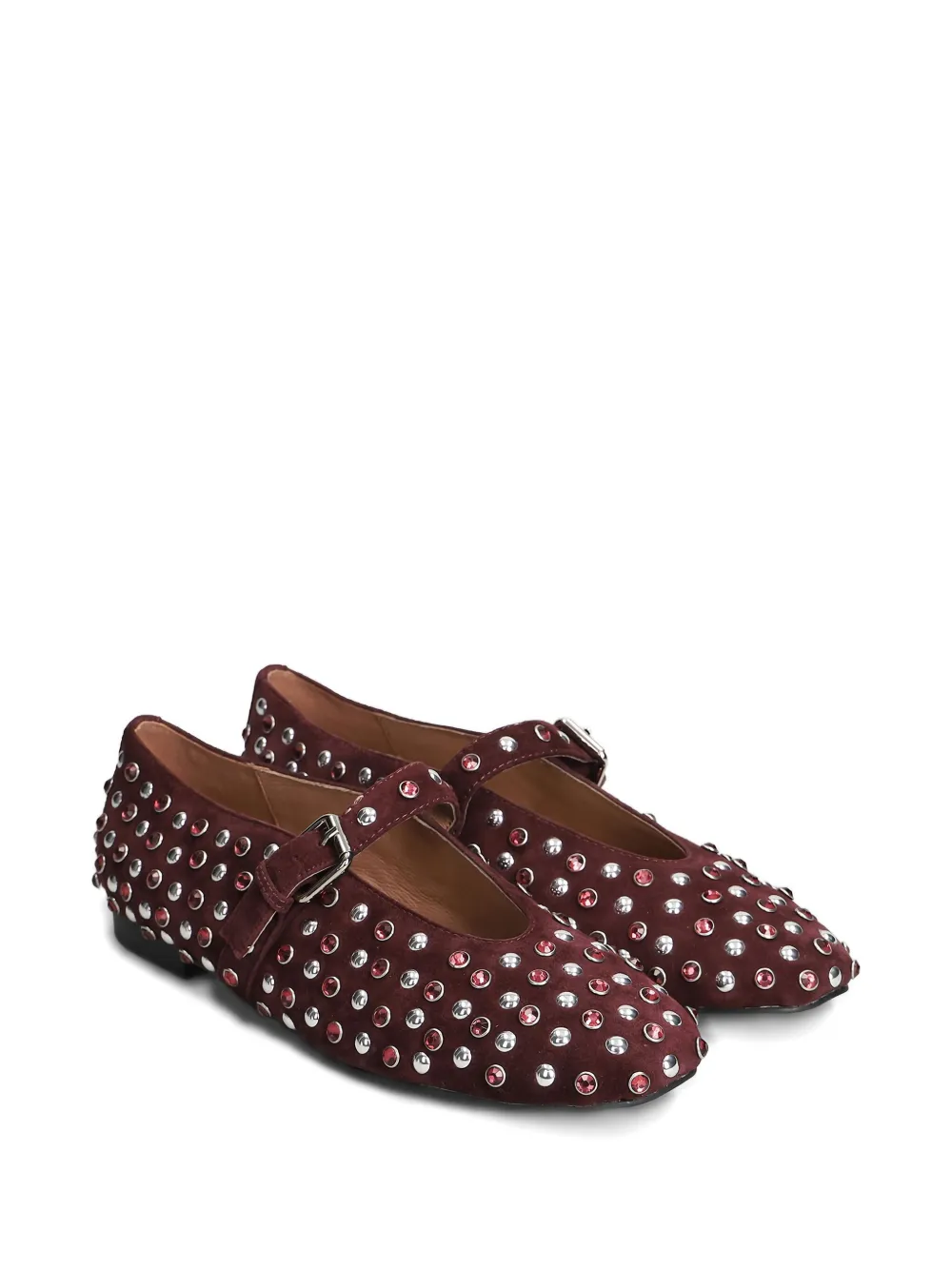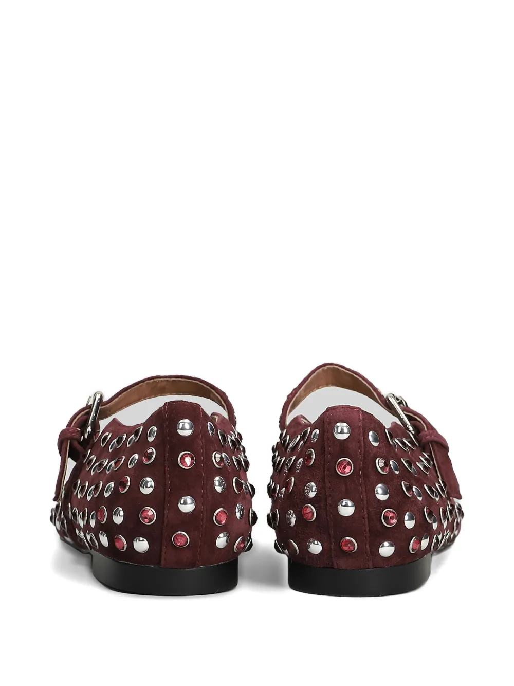 Бордовые туфли с украшением в виде заклепок, ремешком с пряжкой, круглым носком и плоской подошвой