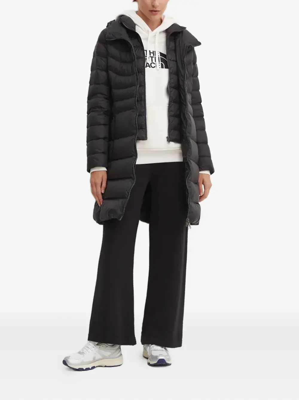 Черная стеганая куртка с капюшоном, застежкой-молнией, длинными рукавами и нашивкой с логотипом