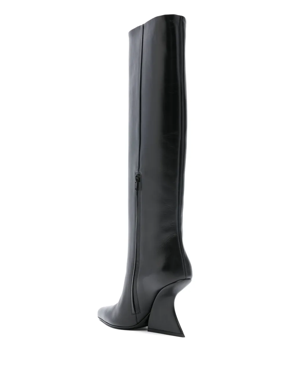Черные сапоги до колена с заостренным носком, скульптурным каблуком и застежкой-молнией сбоку
