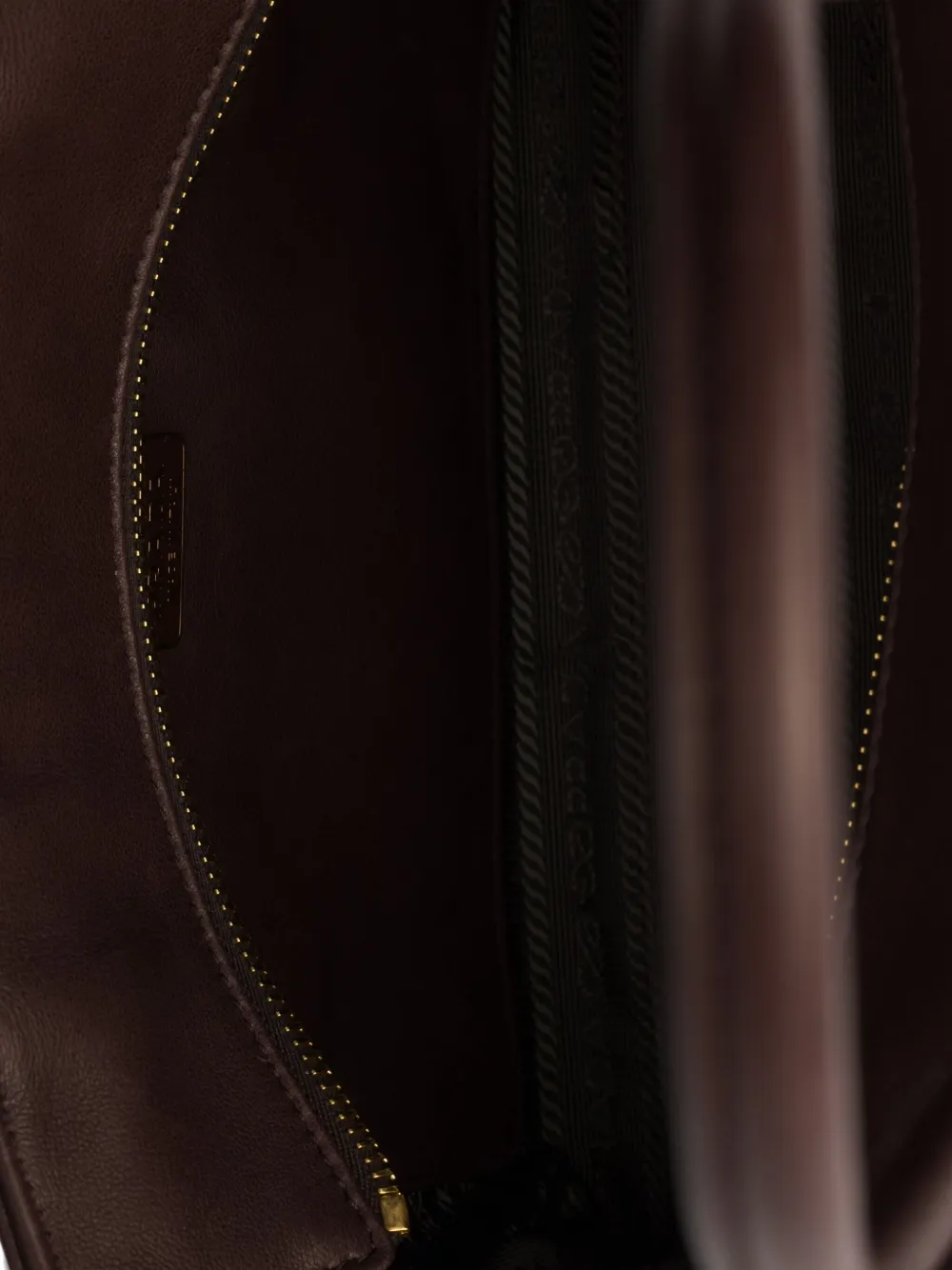 Коричневые кожаные ручки, передний карман, застежка на пряжке, фурнитура золотистого оттенка