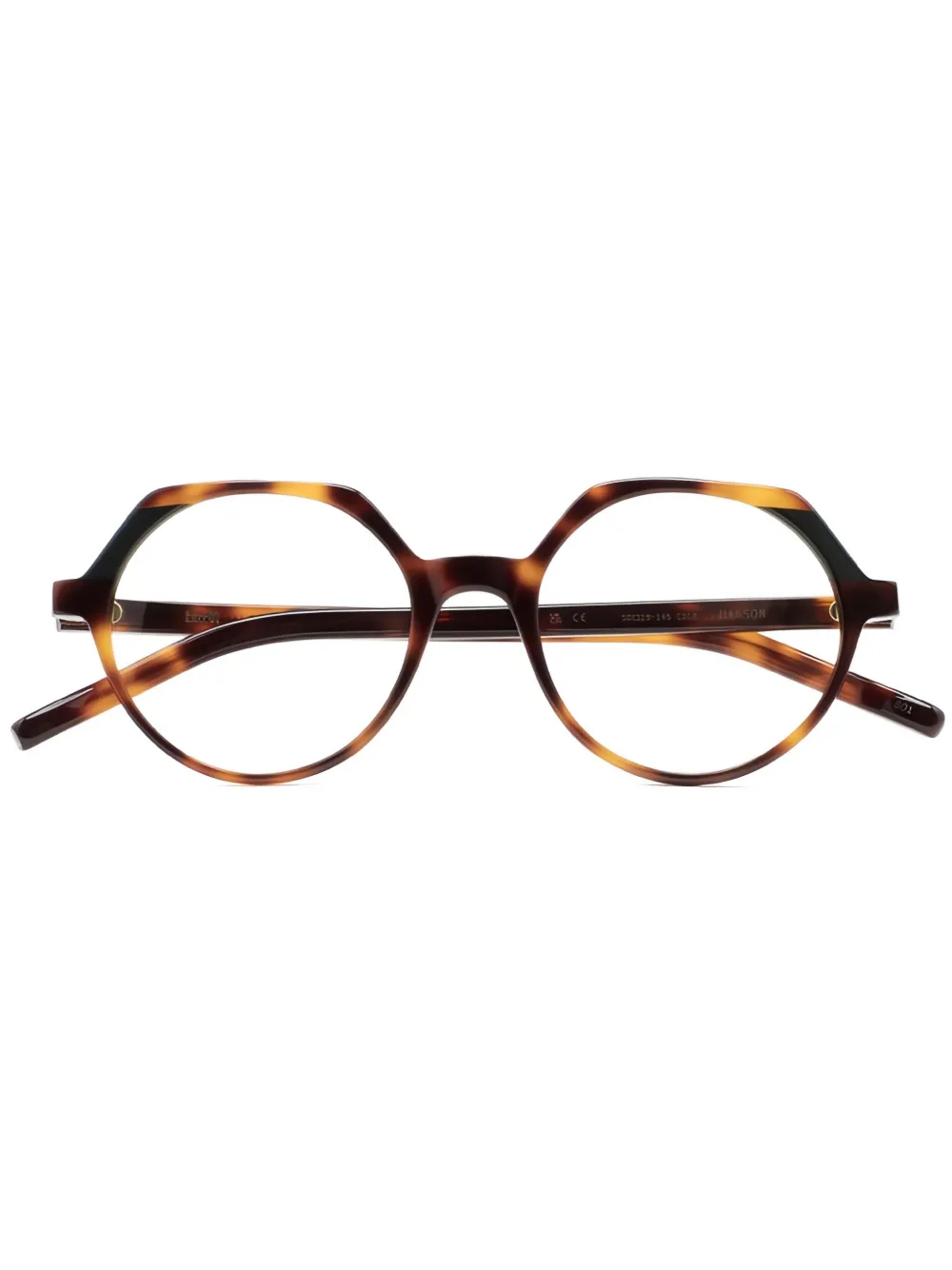 Коричневая оправа геометрической формы, круглые линзы, носовые упоры, прямые заушники, изогнутые концы заушников. Эти очки поставляются с защитным футляром. Все очки FARFETCH продаются как оправа без диоптрий.