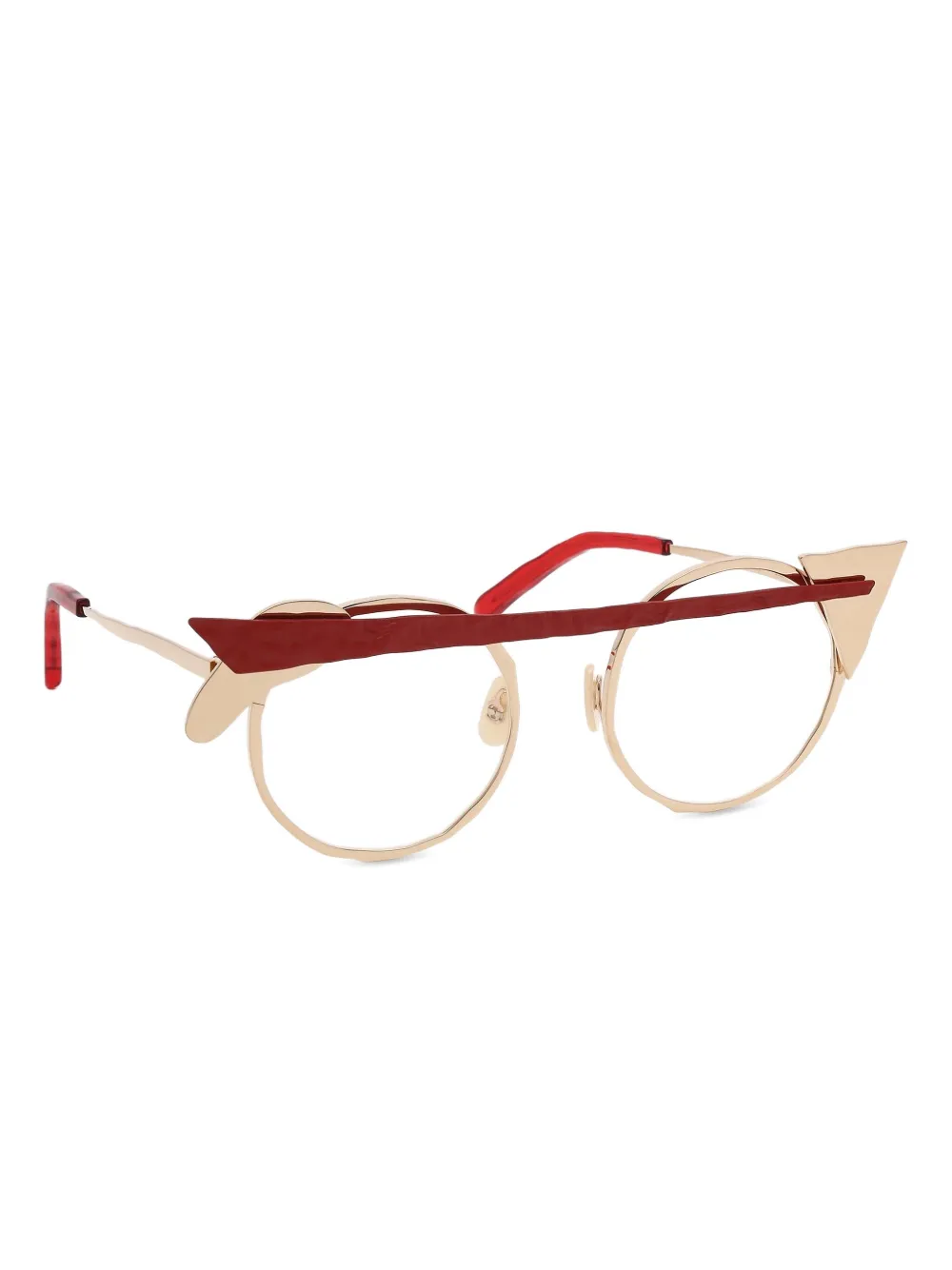 Золотые круглые оправы с красными наконечниками заушников, носовыми упорами, текстурированными и геометрическими деталями. Все очки на FARFETCH продаются как оправа без диоптрий. Эти очки поставляются с защитным футляром.