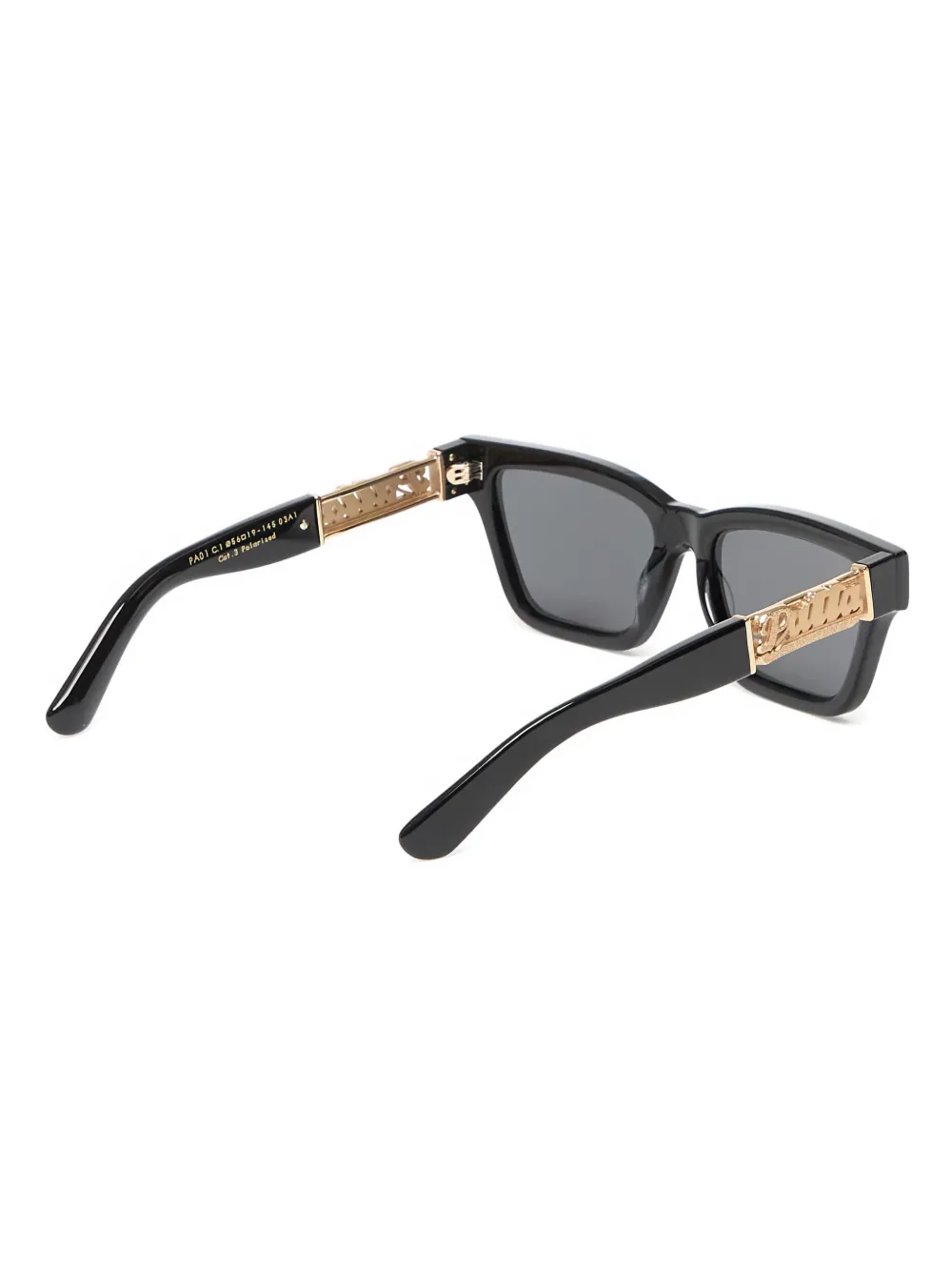 Черная квадратная оправа, тонированные линзы, носоупоры, фирменный штамп. Эти очки поставляются с защитным футляром.
