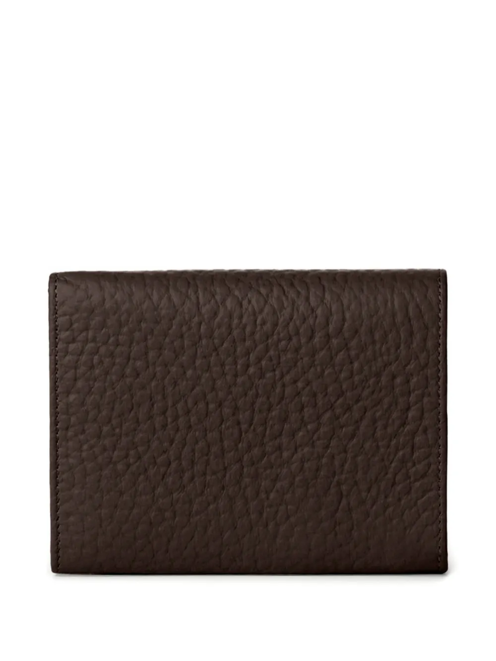 Темно-коричневый цвет, зернистая текстура, откидная верхняя часть, застежка на кнопку, логотип в виде надписи, отделение для купюр