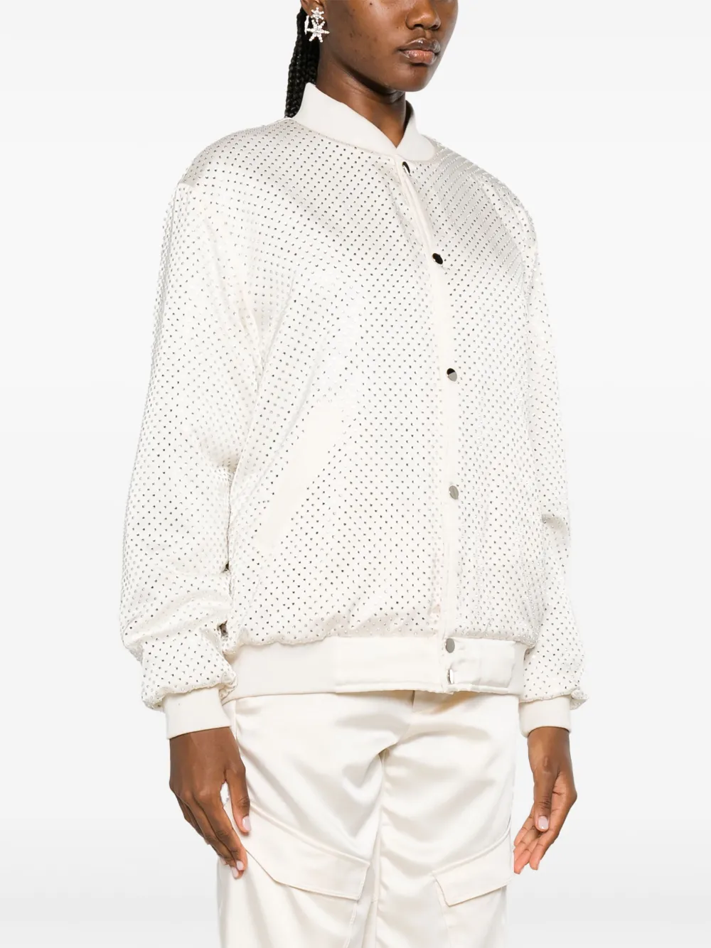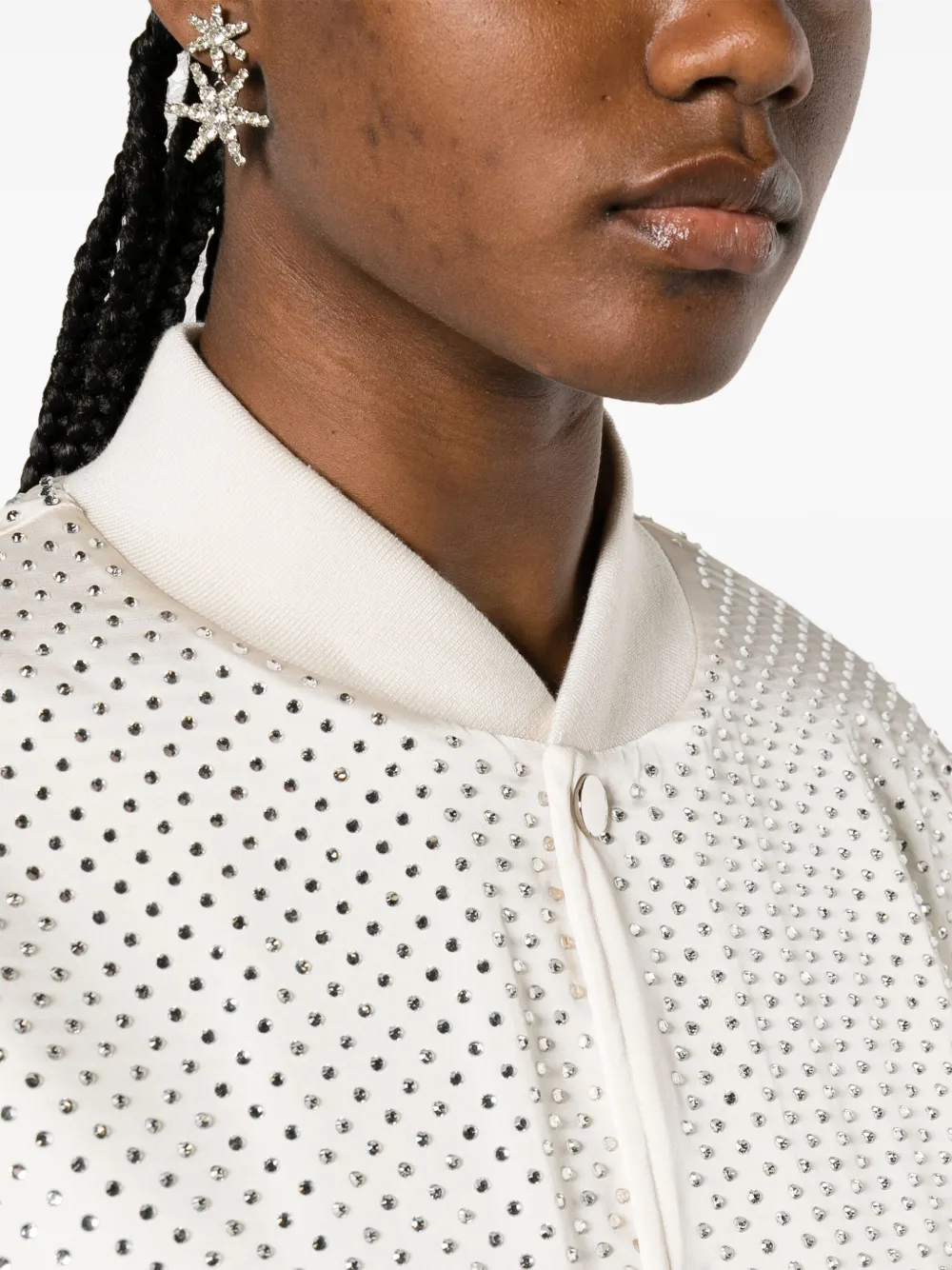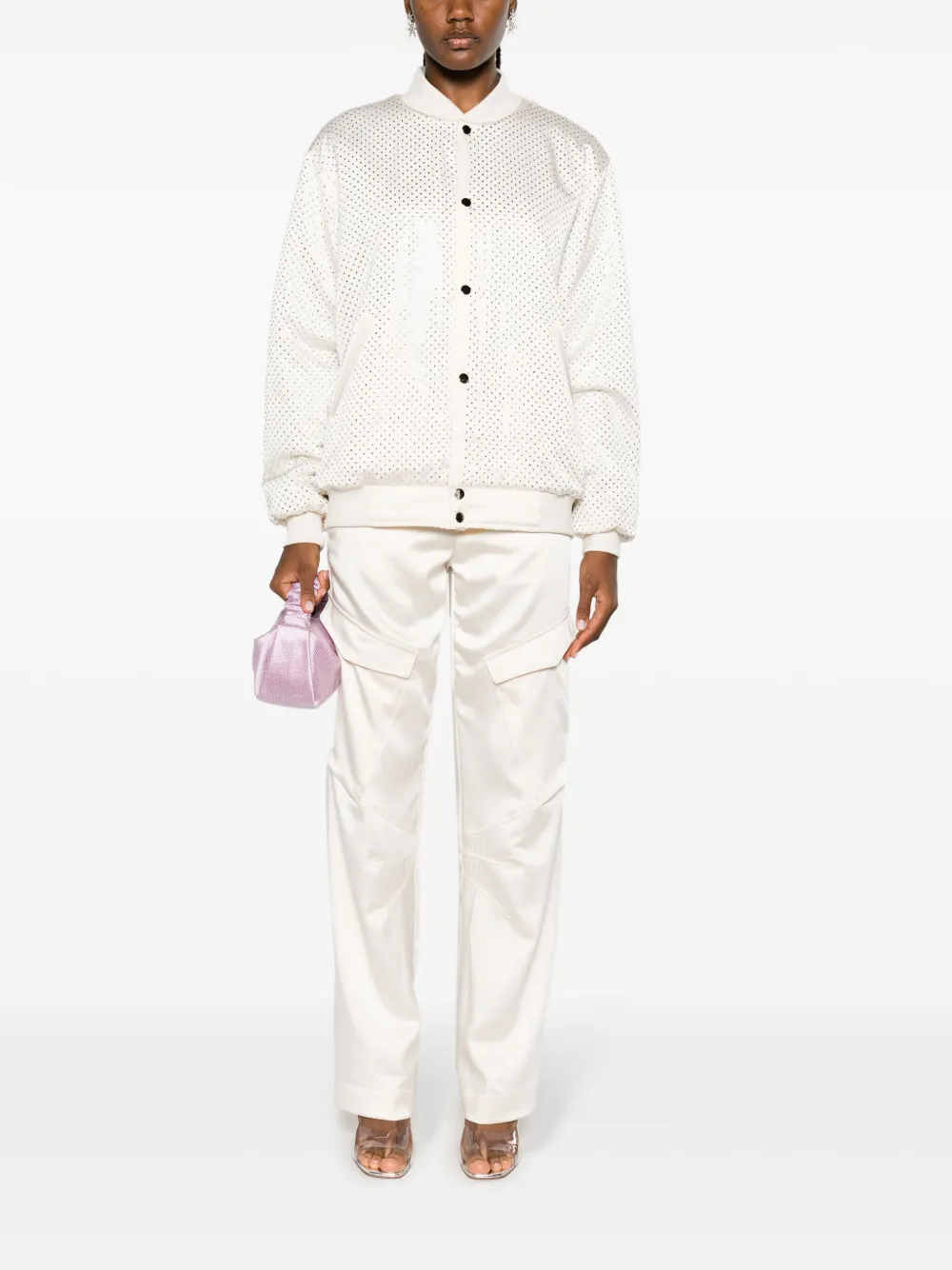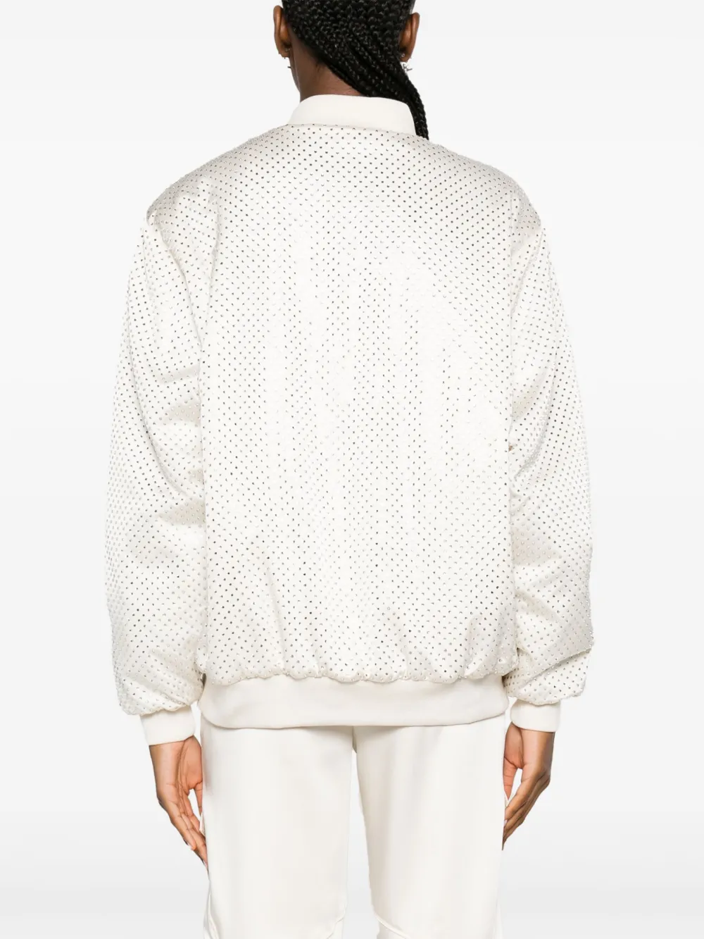 Белый, декор из стеклянных кристаллов, бейсбольный воротник, застежка на кнопках спереди, длинные рукава и два передних кармана с листочкой.