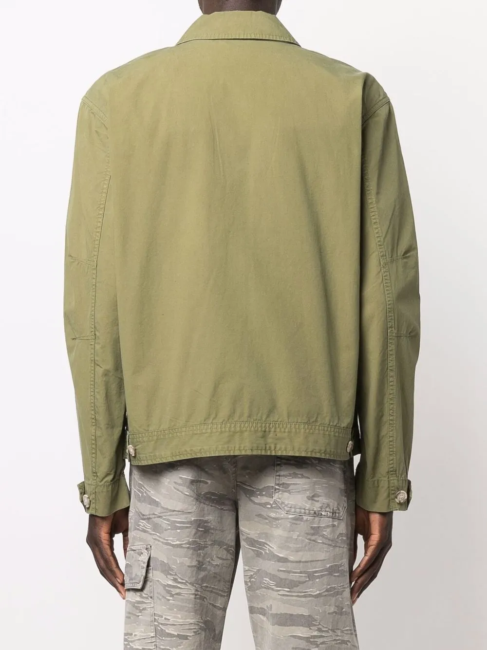Прямой воротник, застежка на молнии спереди, длинные рукава, два передних кармана с клапанами и прямой подол.
