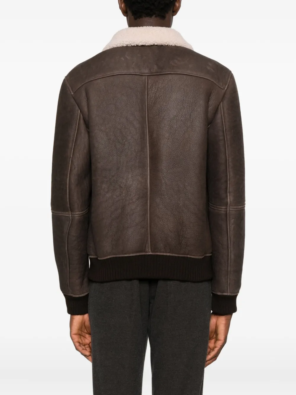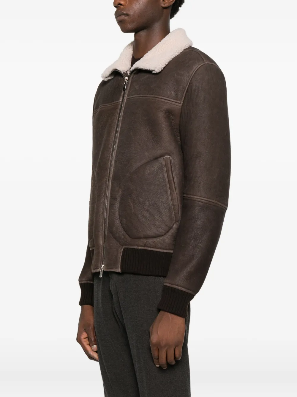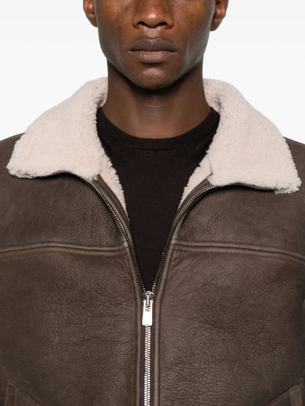 Темно-коричневый цвет, воротник из овчины, застежка-молния, ребристый край по низу, ребристые манжеты, передние карманы