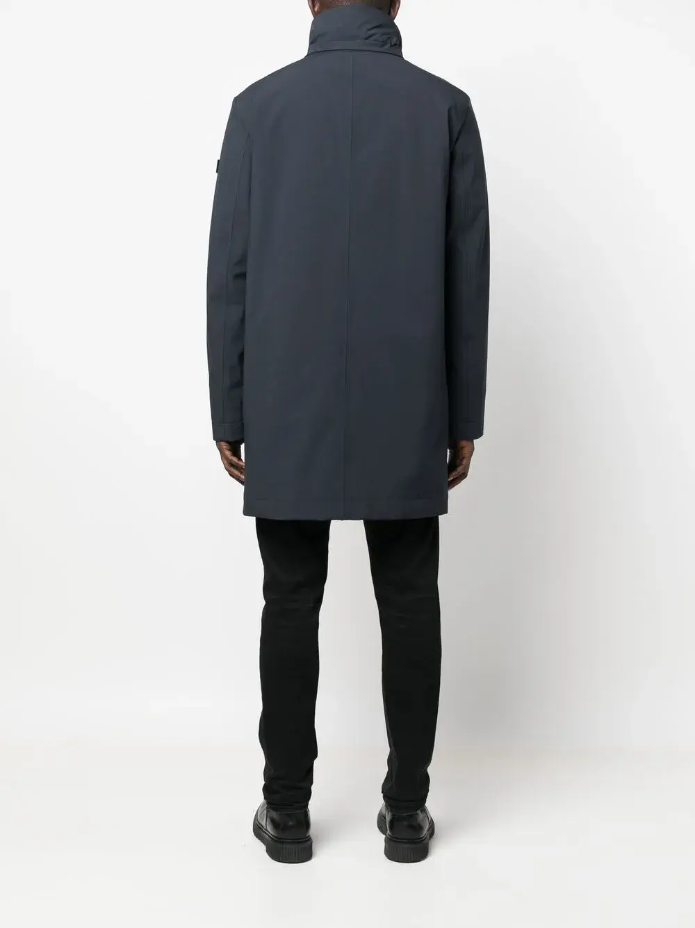 Темно-синий, нашивка с логотипом на рукаве, воротник-труба, длинные рукава, потайная молния спереди, прямой подол и длина миди.