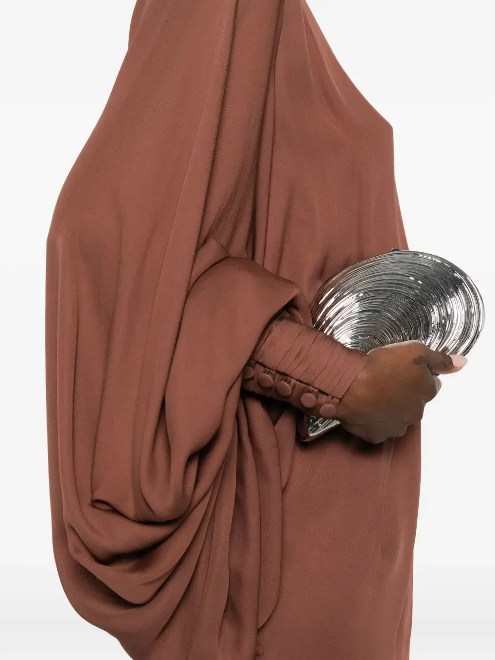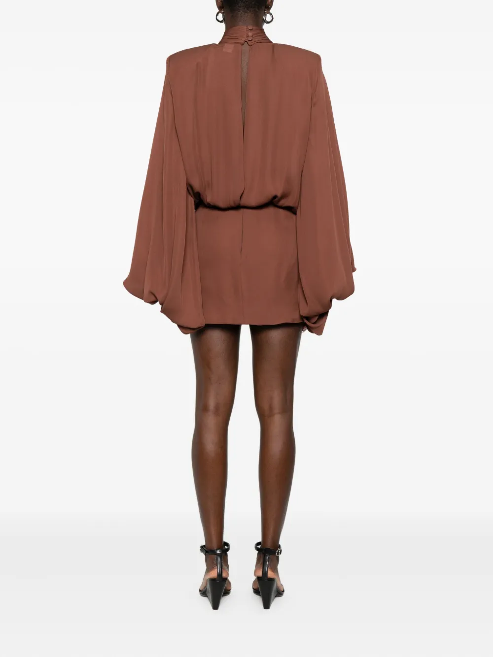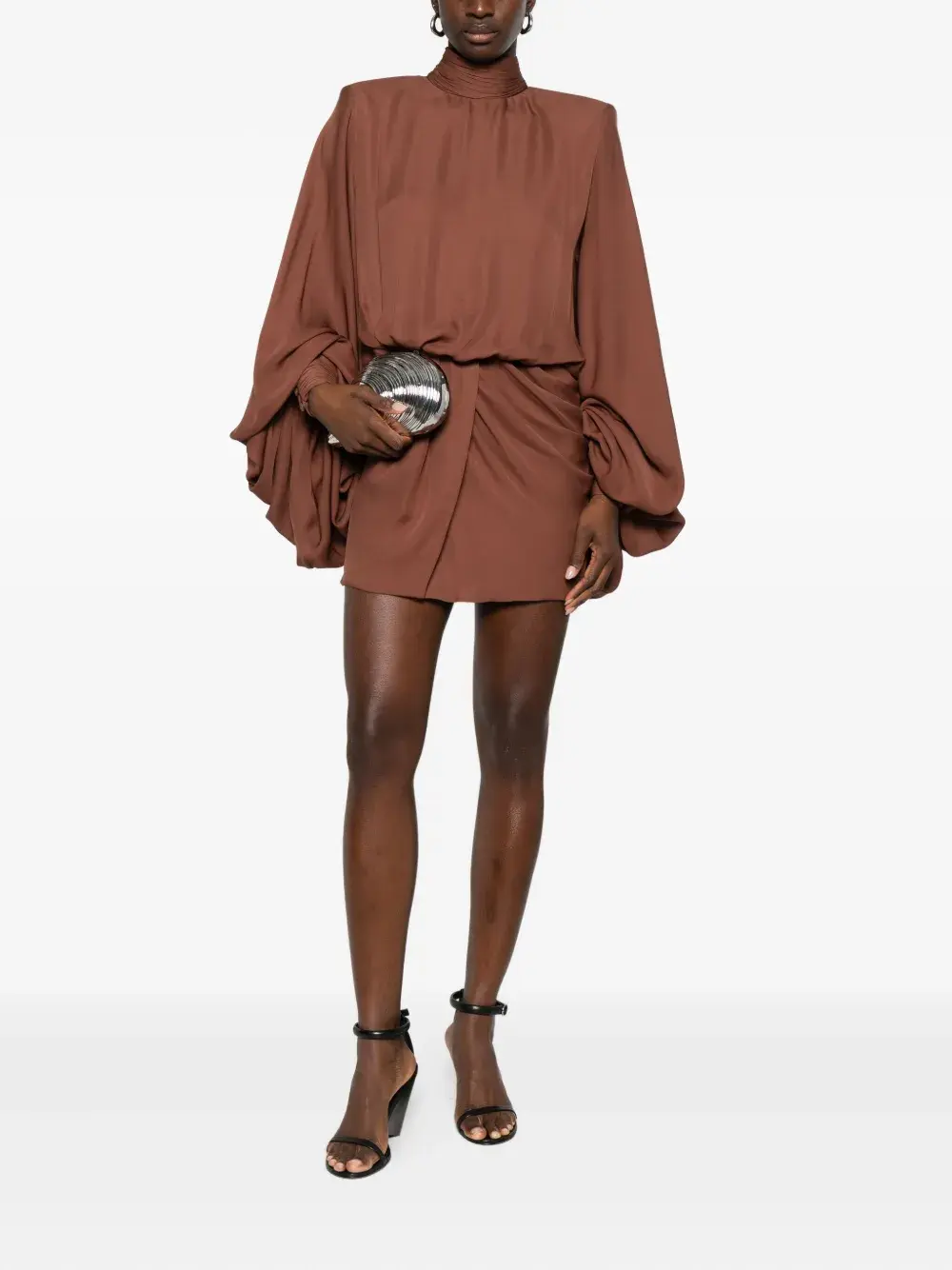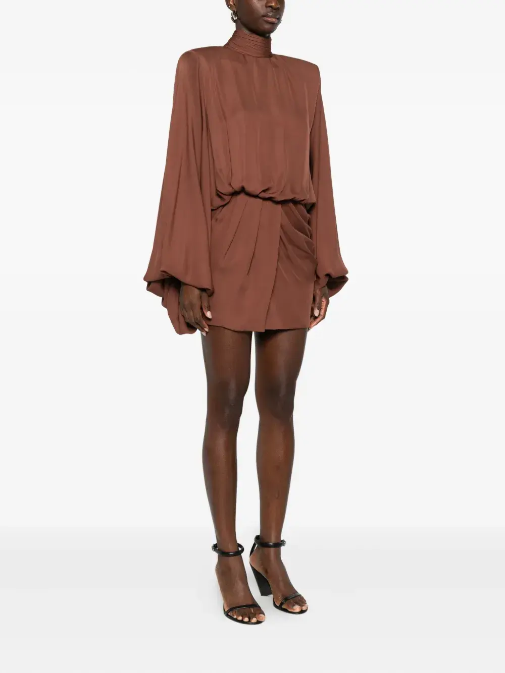 Коричневое платье с высоким воротом, сборками, длинными рукавами, присборенной талией и драпировкой