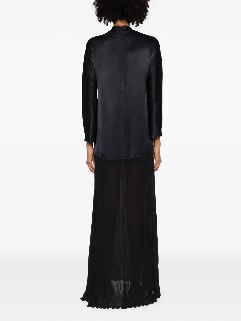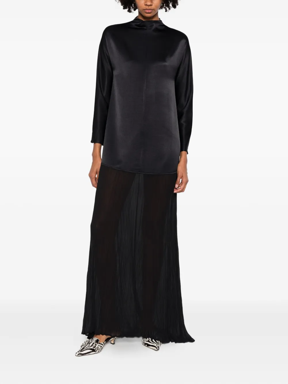 Черная плиссированная юбка, длинные рукава, высокий ворот, асимметричный подол, застежка-молния сзади