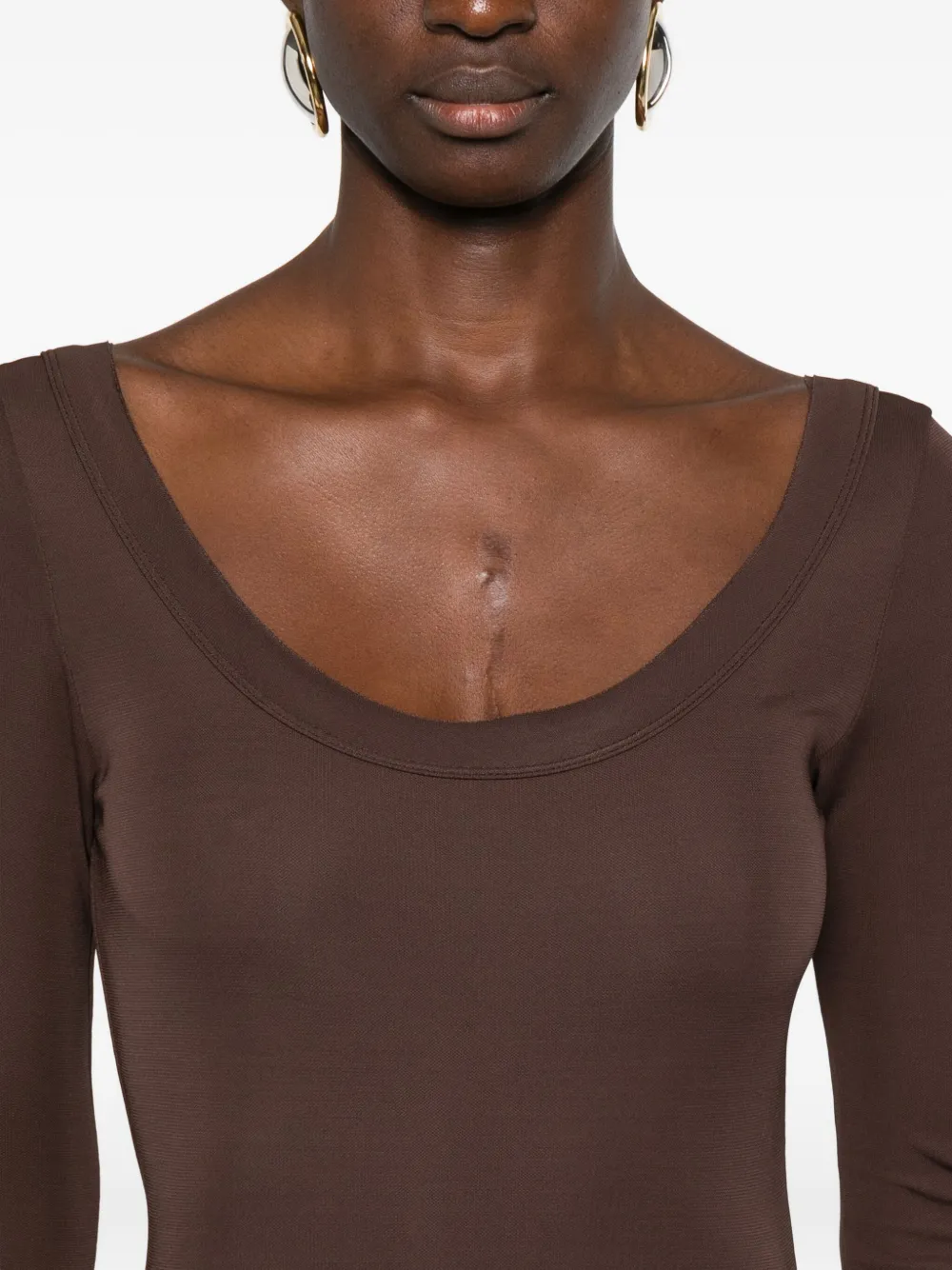 Коричневый топ с круглым вырезом, длинными рукавами и драпировкой
