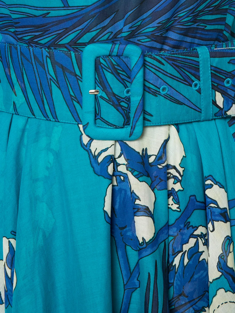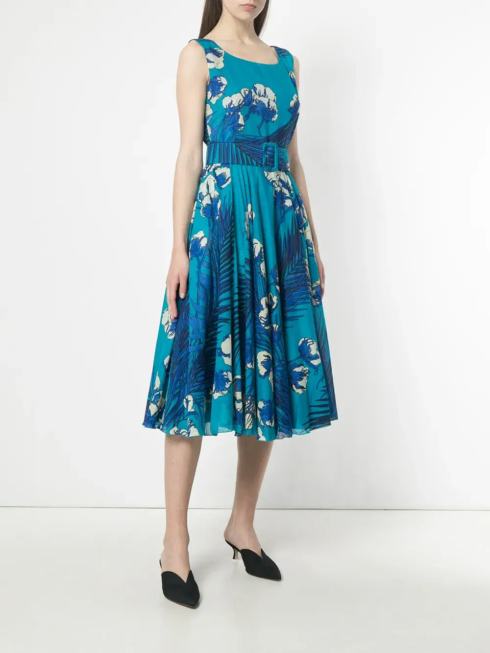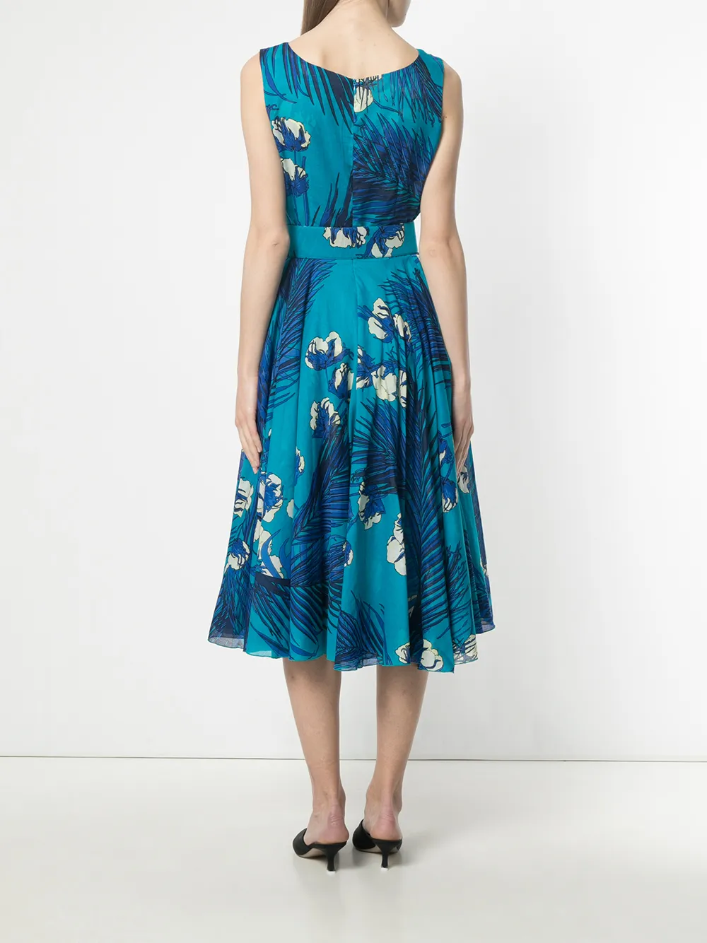 Синее платье из эластичного хлопка с рисунком из цветов и листьев от Samantha Sung. Модель без рукавов, круглый вырез, ремень на талии, потайная застежка на молнию сзади.