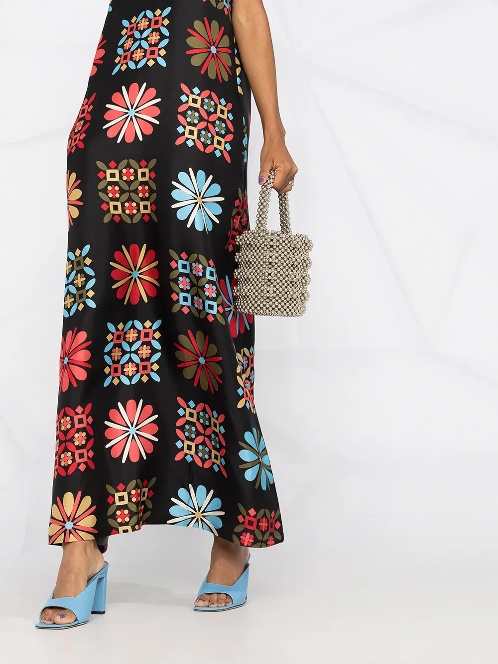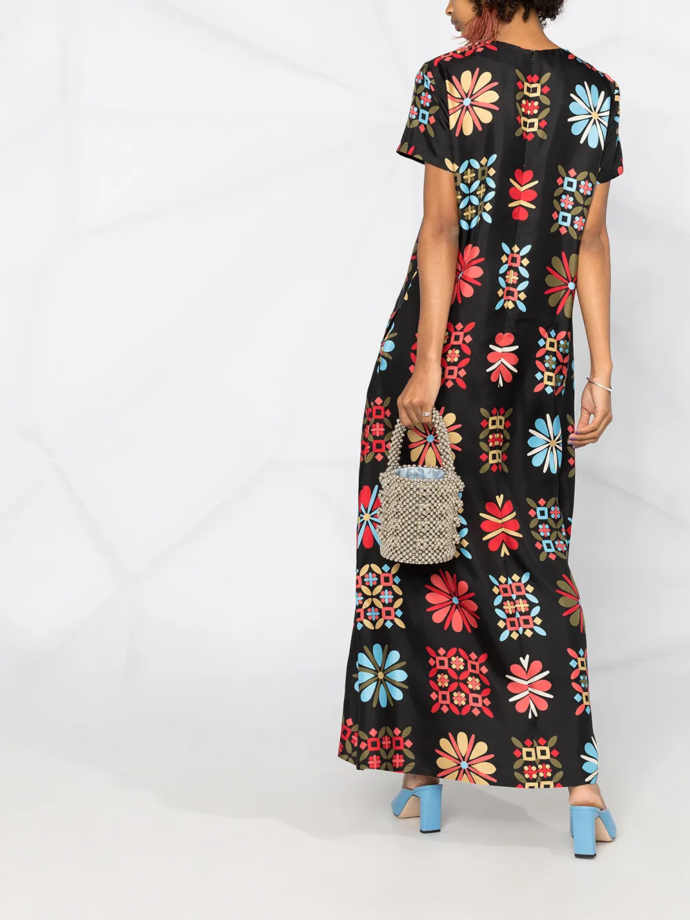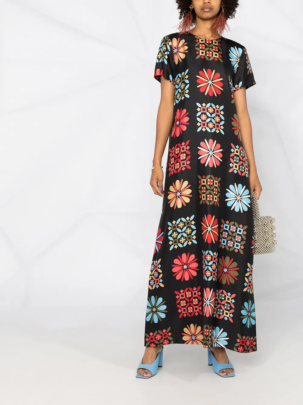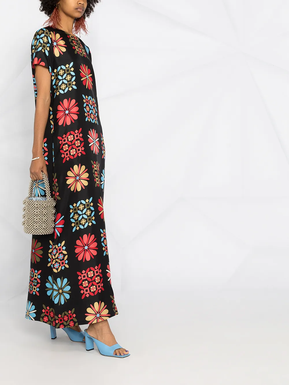 Абстрактный принт, круглый вырез, короткие рукава и длина макси. Цвет: черный.