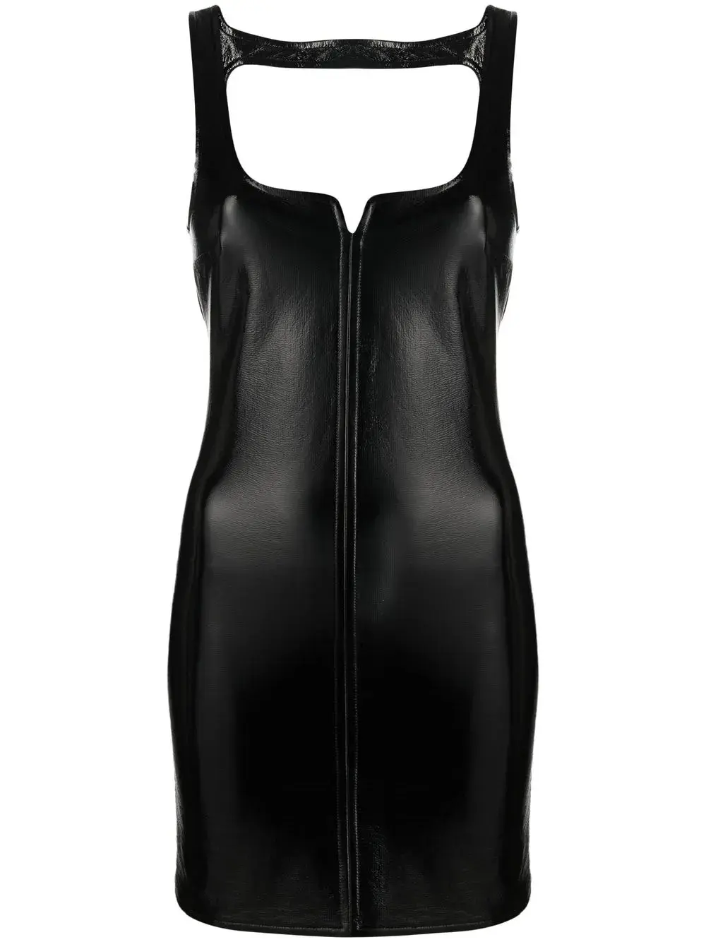 Черный, глянцевая фактура, обтягивающий юбка, без рукавов и длина выше колена.