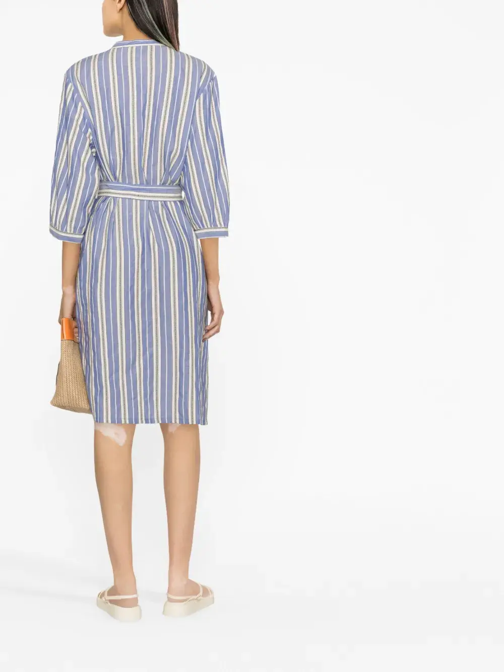 Синий/белый, хлопок, узор в вертикальную полоску, воротник-стойка, рукава по локоть, кулиска на талии, застежка на пуговицах спереди и длина по колено.
