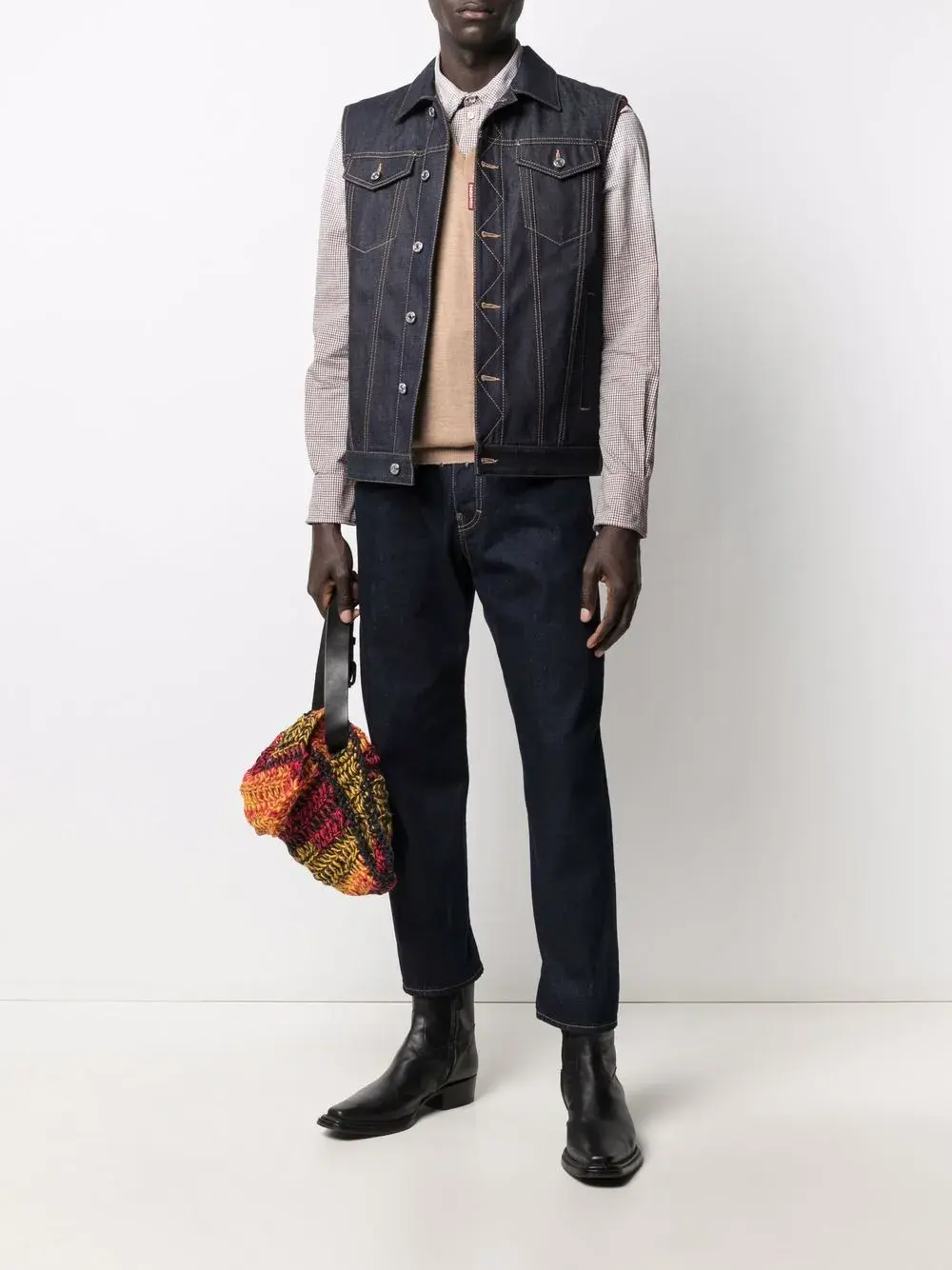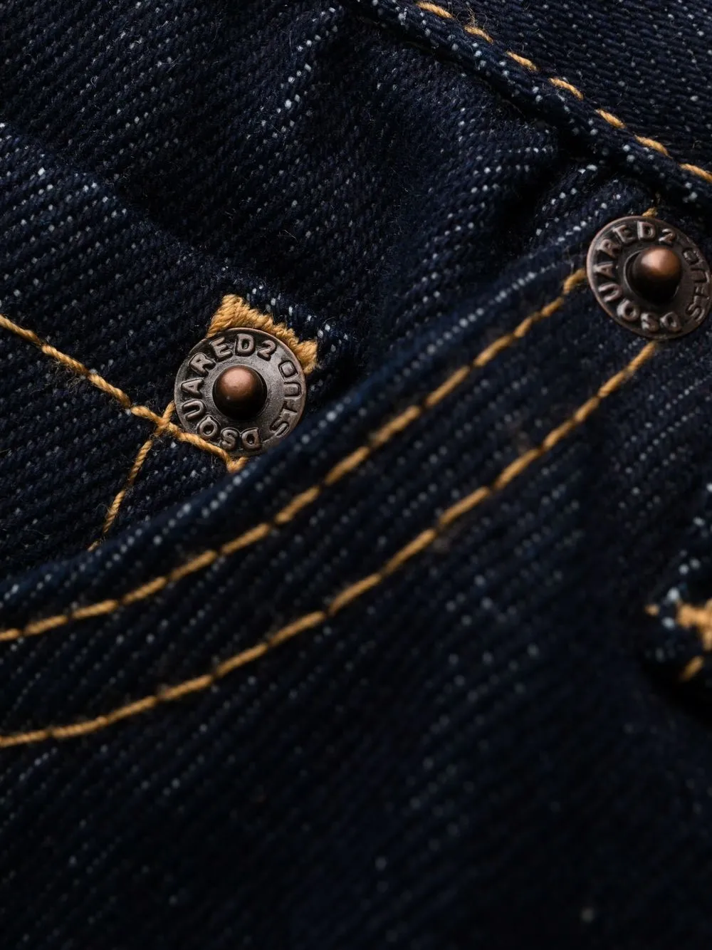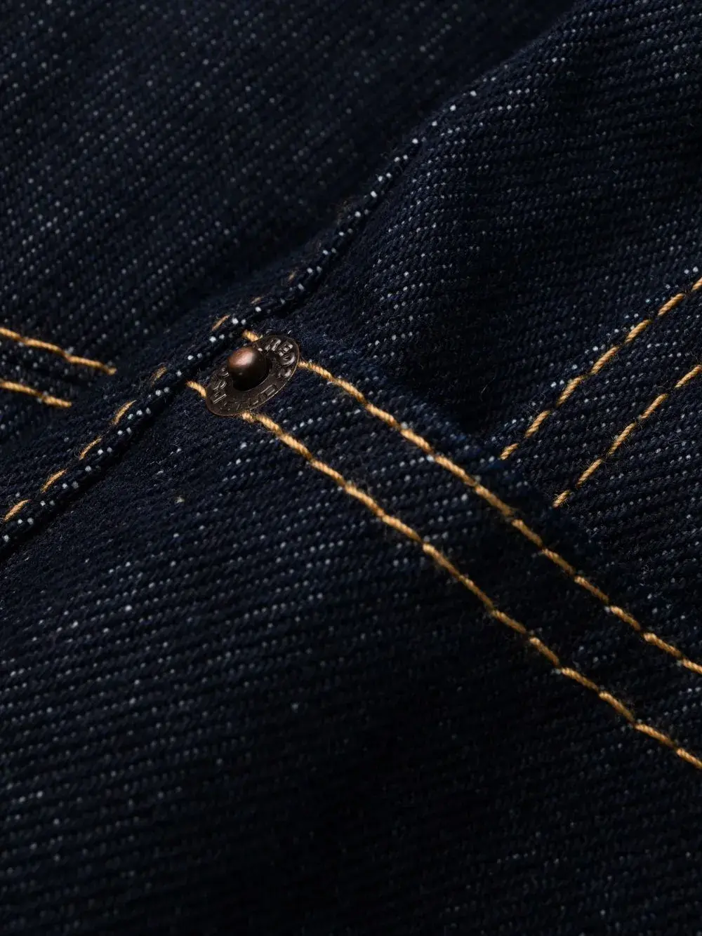 Контрастная строчка, прямой крой, укороченная длина, петли для ремня, потайная застежка спереди и классическая пятикарманная модель.