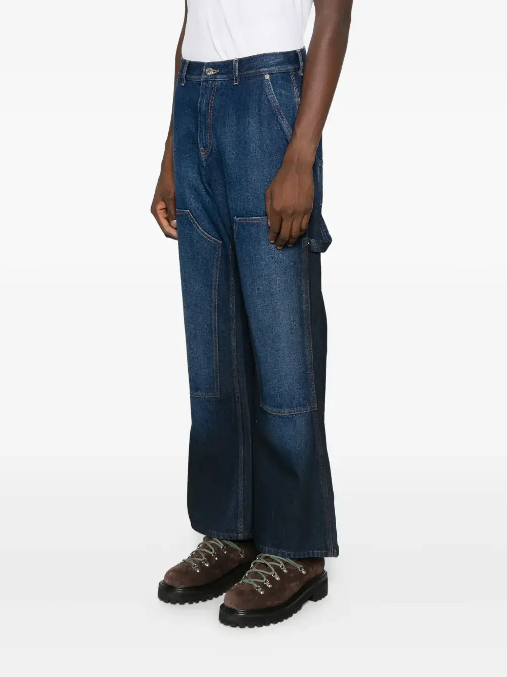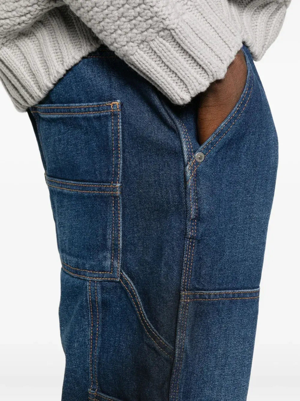 Средне-синий цвет, панельный дизайн, детали с логотипом, боковой карман для инструментов, шлевки для ремня, пять карманов