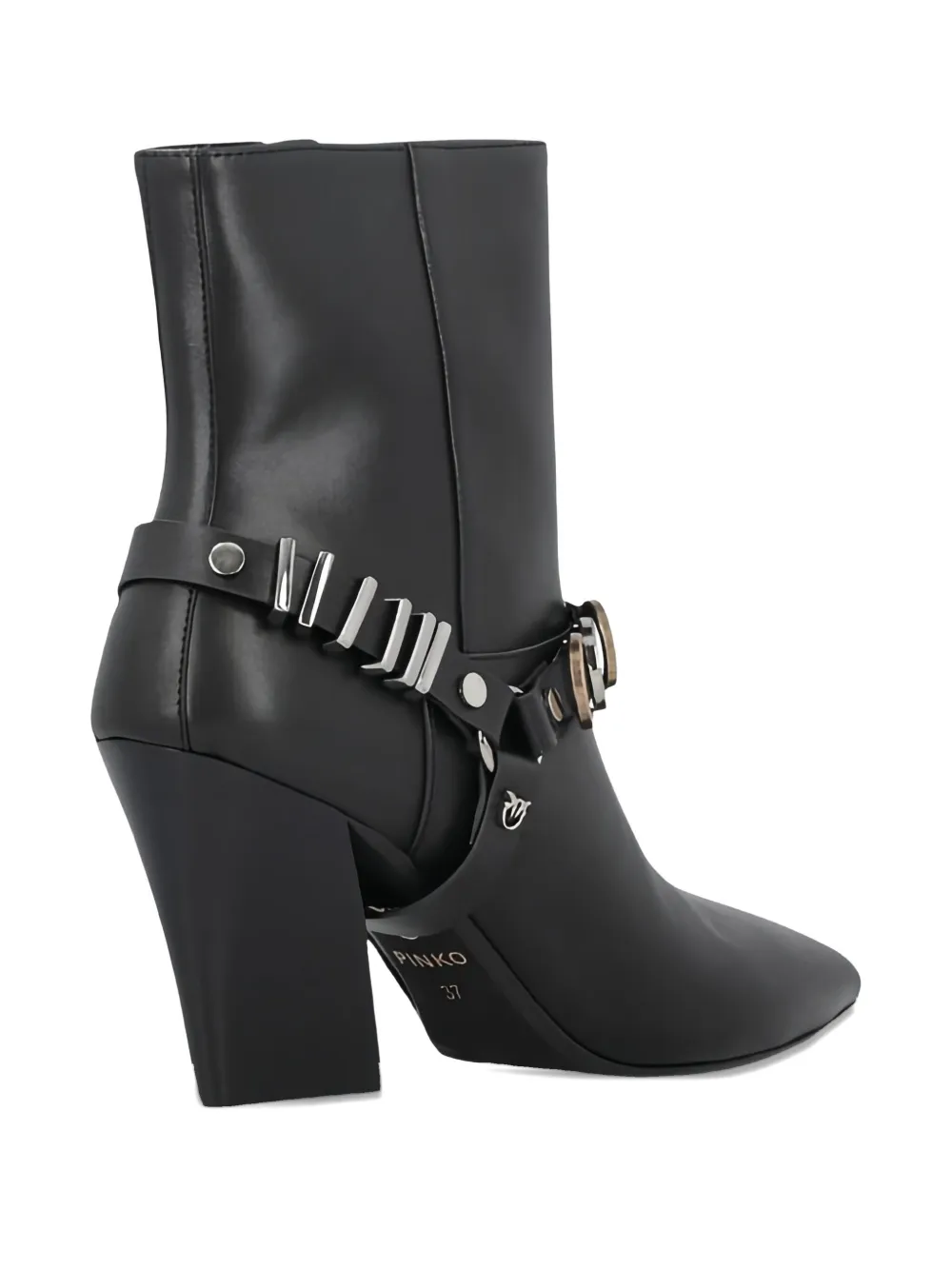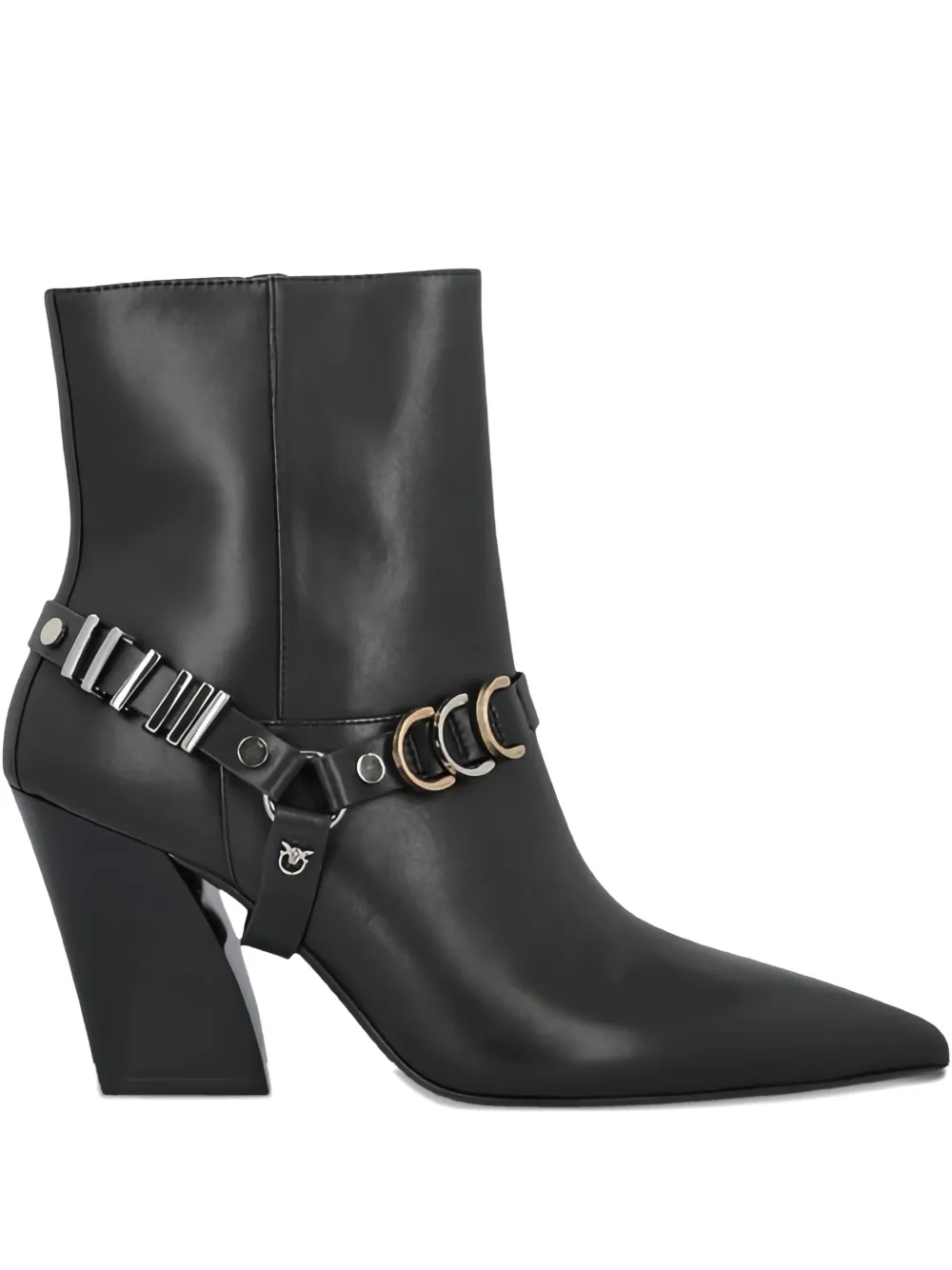 Черные ботильоны с деталями в виде ремней, заостренным носком, на устойчивом каблуке, с металлической фурнитурой, до щиколотки
