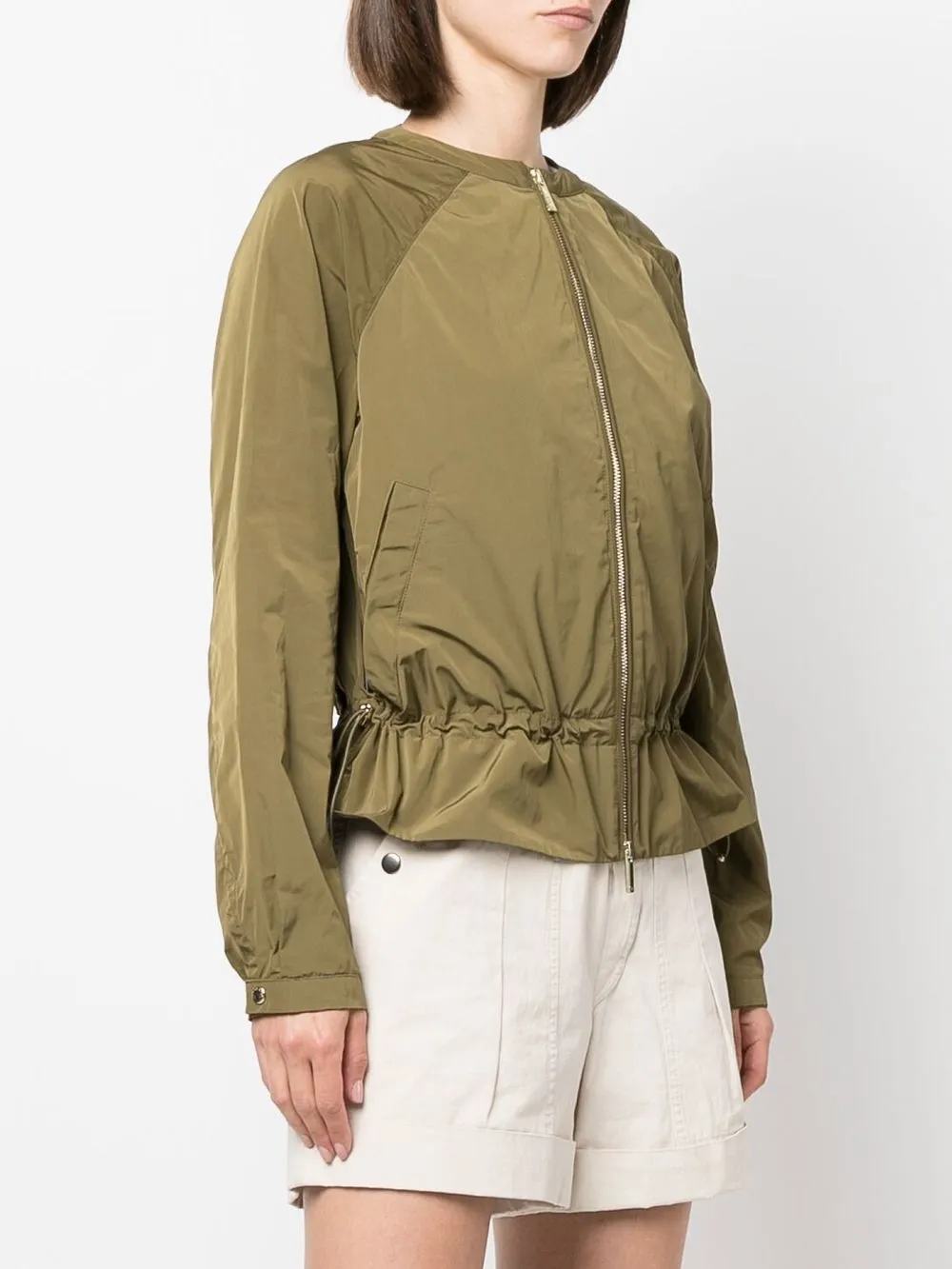 Круглый вырез, застежка на молнии спереди, кулиска на талии и длинные рукава.
