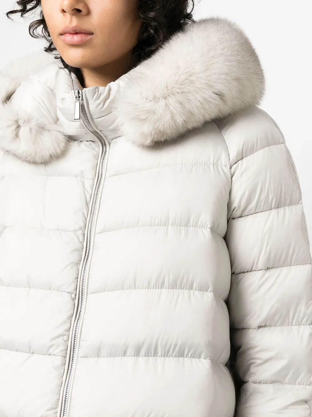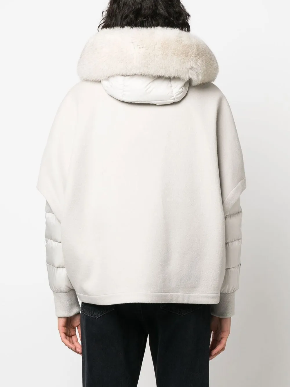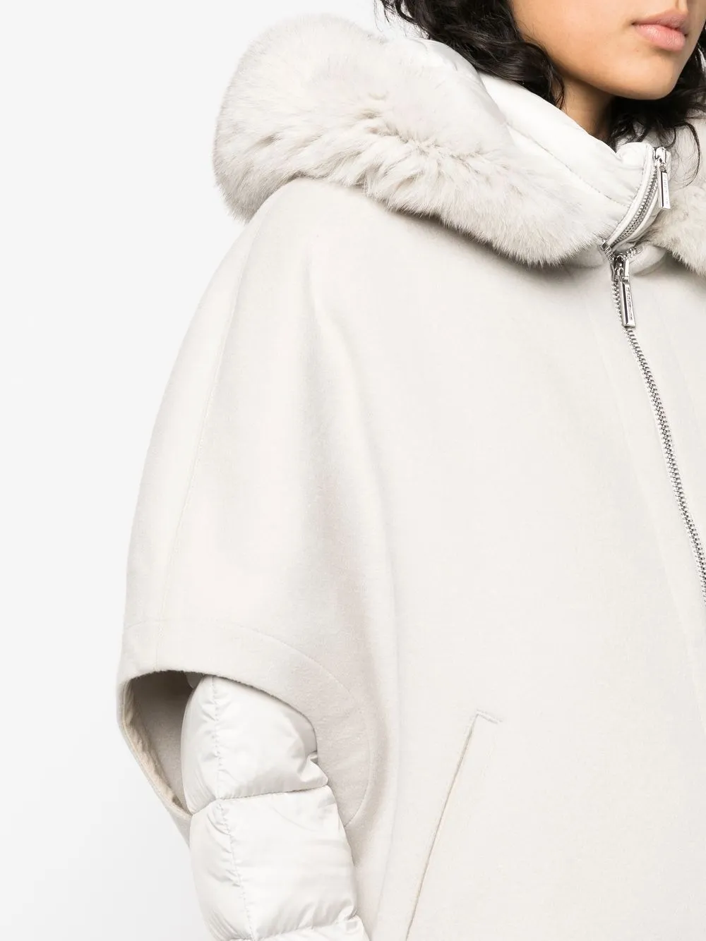 Светло-бежевый, необработанная шерсть, смесь шерсти и кашемира, два вшитых кармана по бокам, дутый материал, многослойный дизайн, капюшон с оторочкой из искусственного меха, застежка на молнии спереди, длинные рукава и манжеты в рубчик.