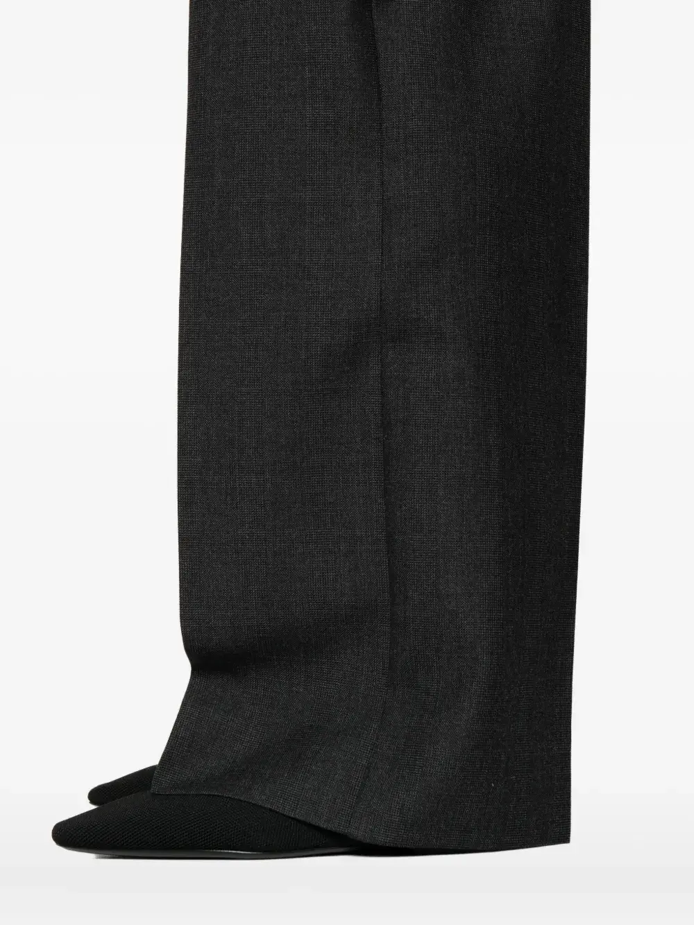 Серые шлевки для ремня, складки, боковые карманы в швах, задний прорезной карман, потайная застежка спереди
